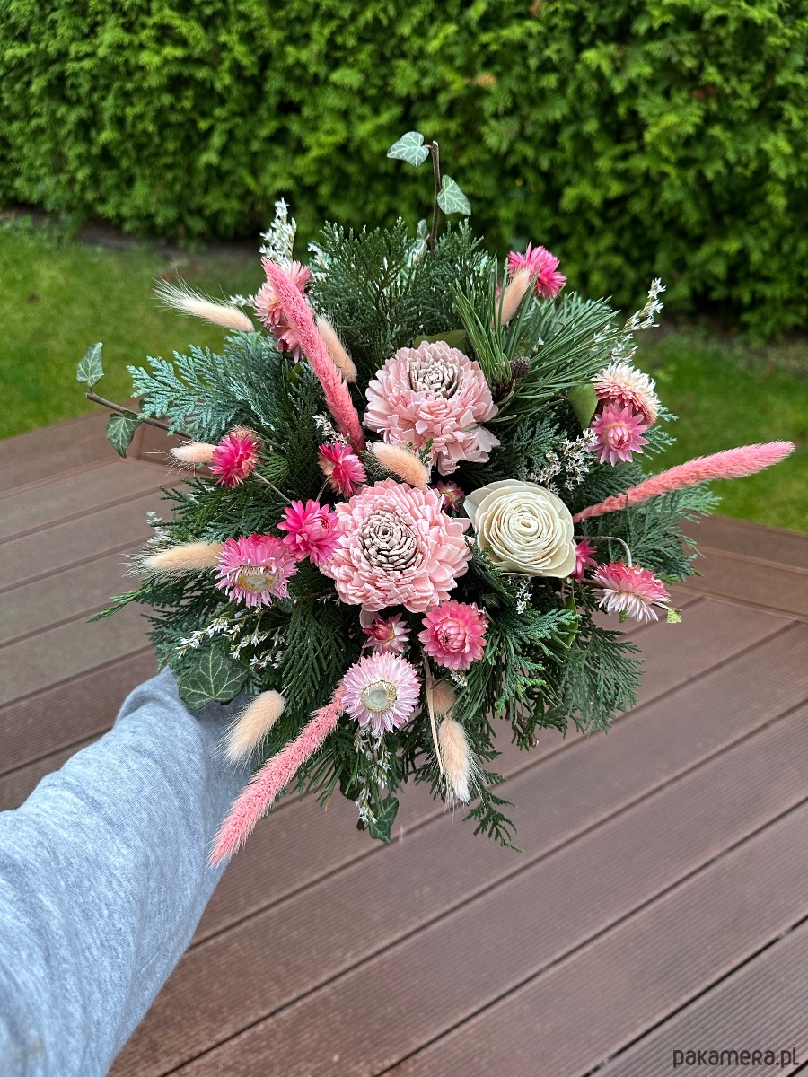 Wiązanka nagrobna z użyciem zieleni żywej ciętej, kwiatów shola oraz suszonych roślin.