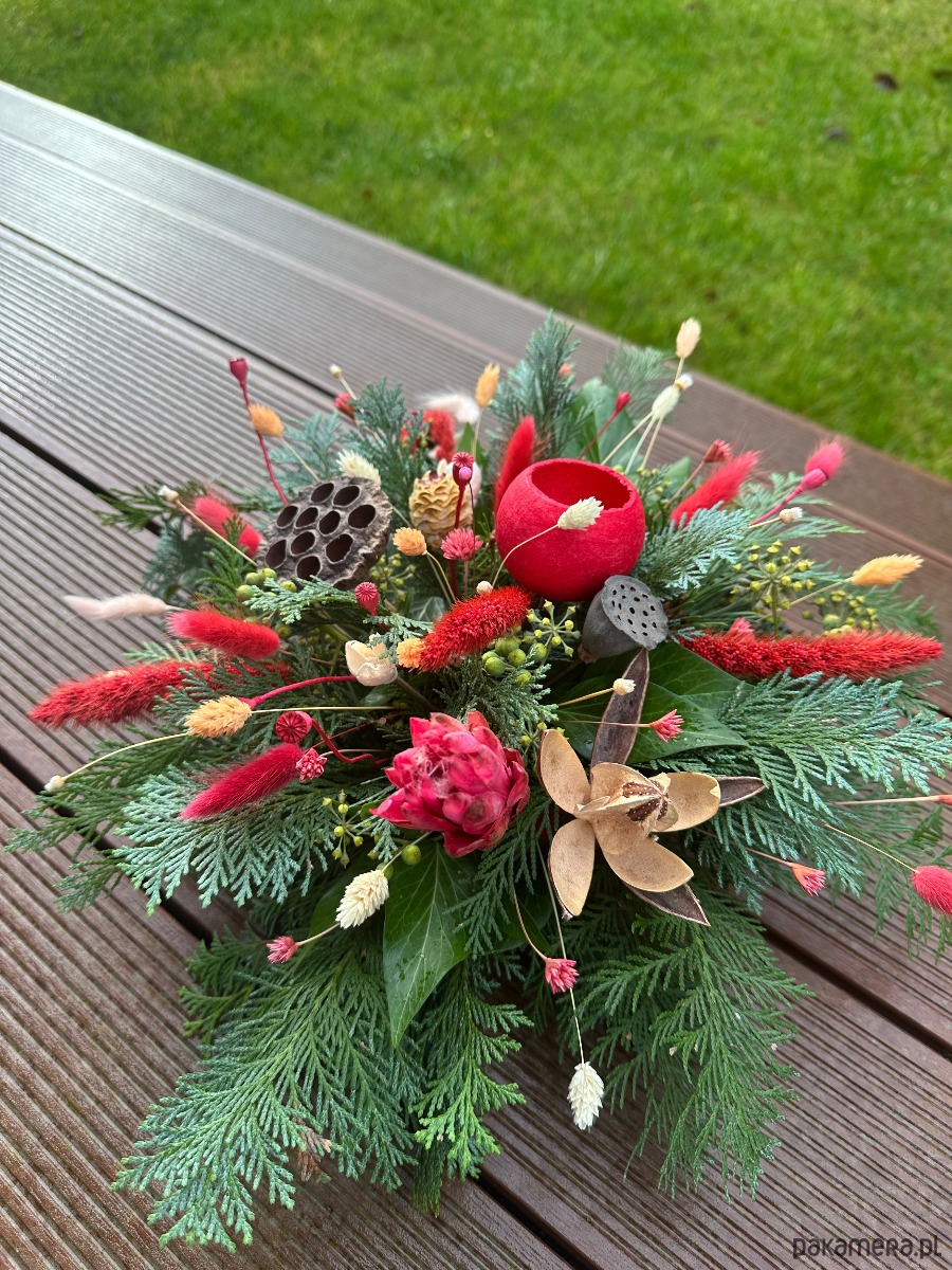 Wiązanka nagrobna z użyciem zieleni żywej ciętej oraz suszonych roślin.