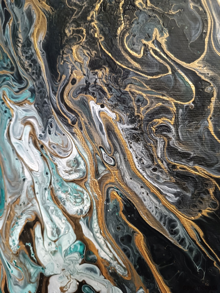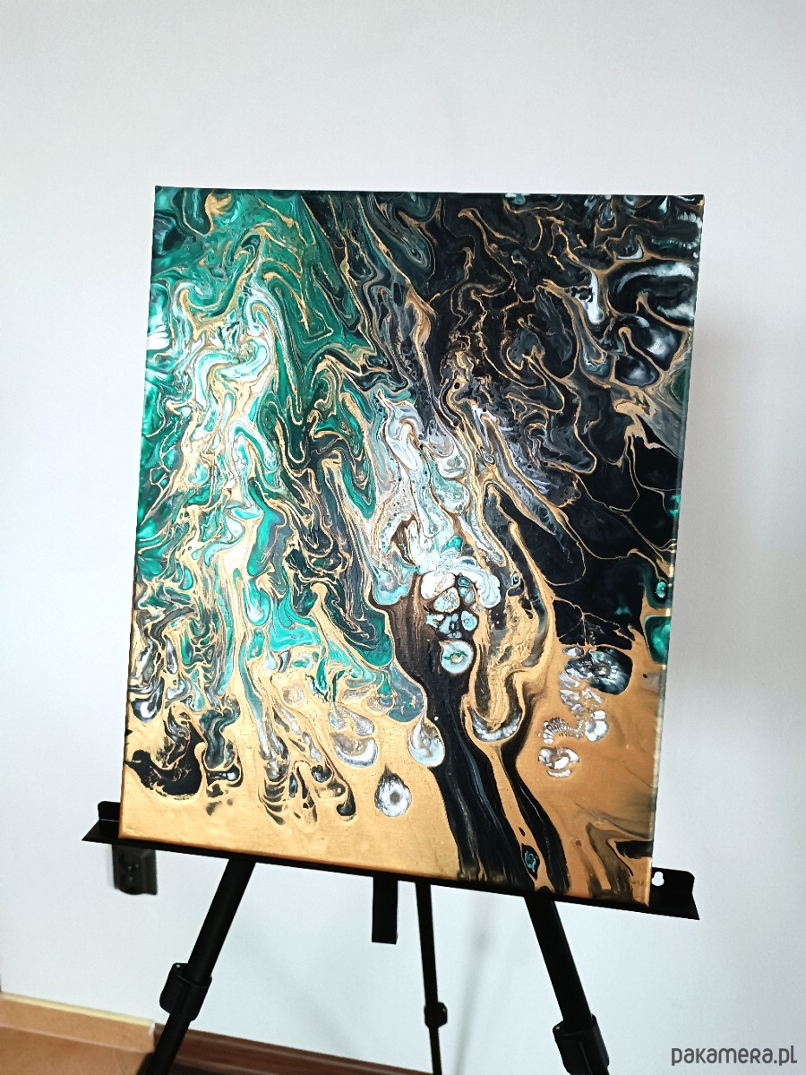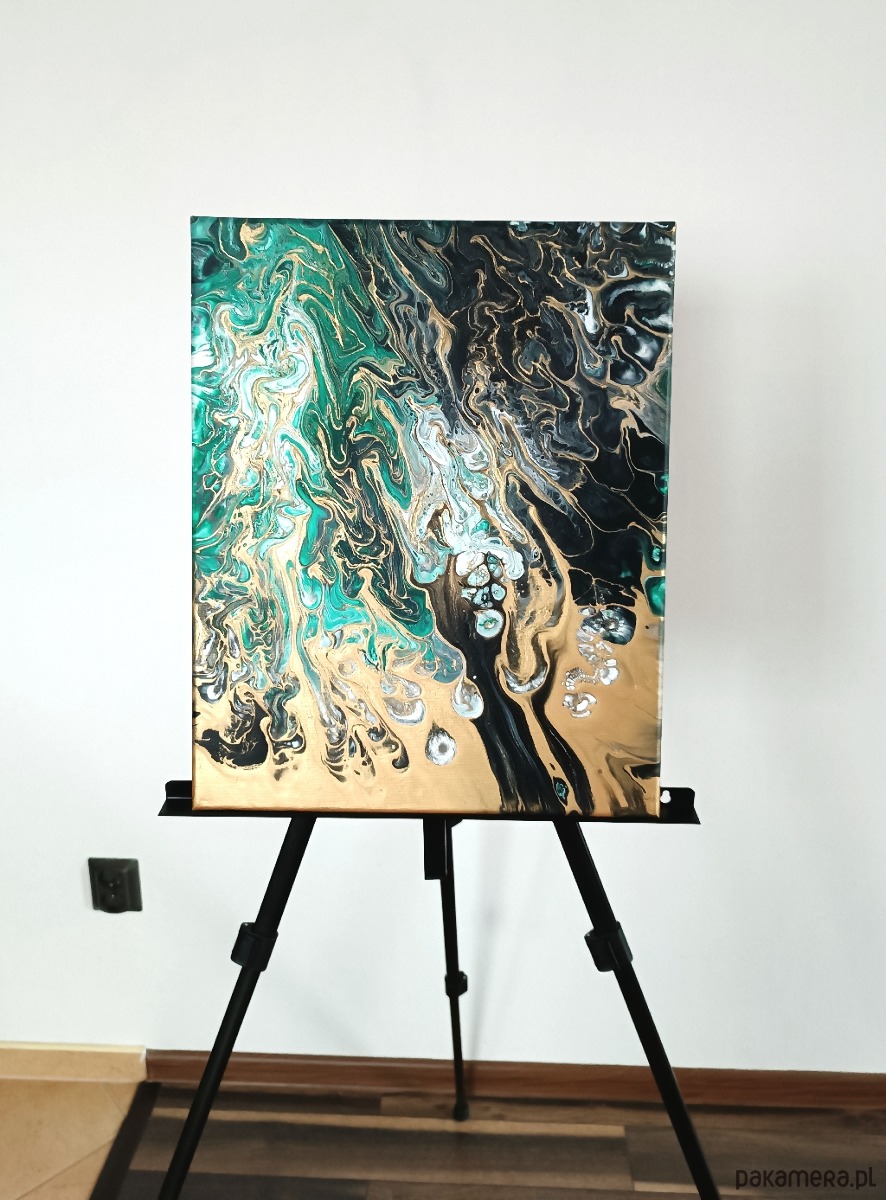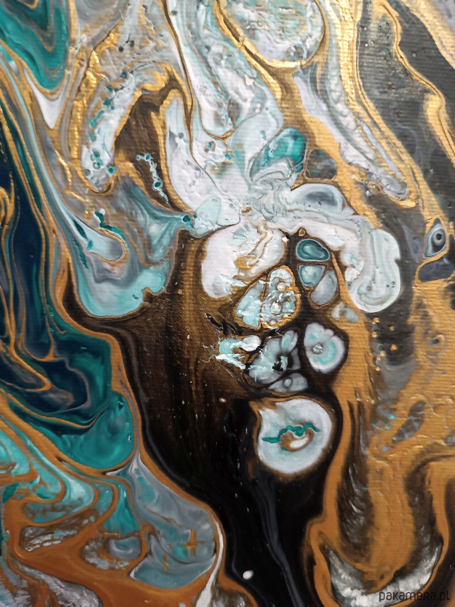Obraz malowany farbami akrylowymi na dobrej jakości podobraziu bawełnianym, zabezpieczony werniksem. Nierówności i spękania uzyskane zostały przy zastosowaniu techniki pouringu, czyli operowania farbami w stanie ciekłym. Sygnowany z boku podobrazia i podpisany z tyłu. Boki są przedłużeniem obrazu - gotowy do powieszenia bez ramy.