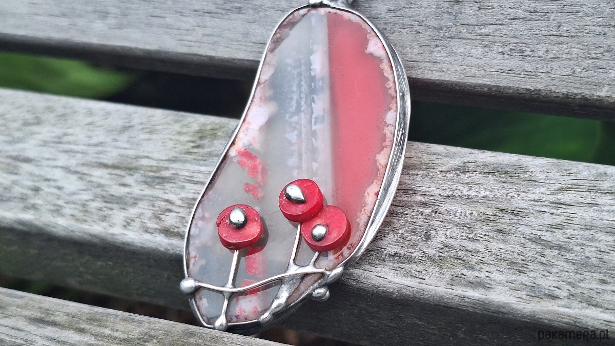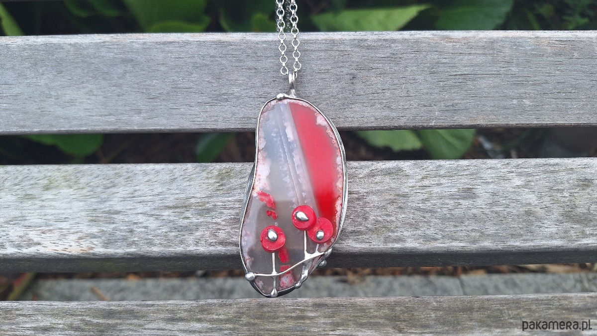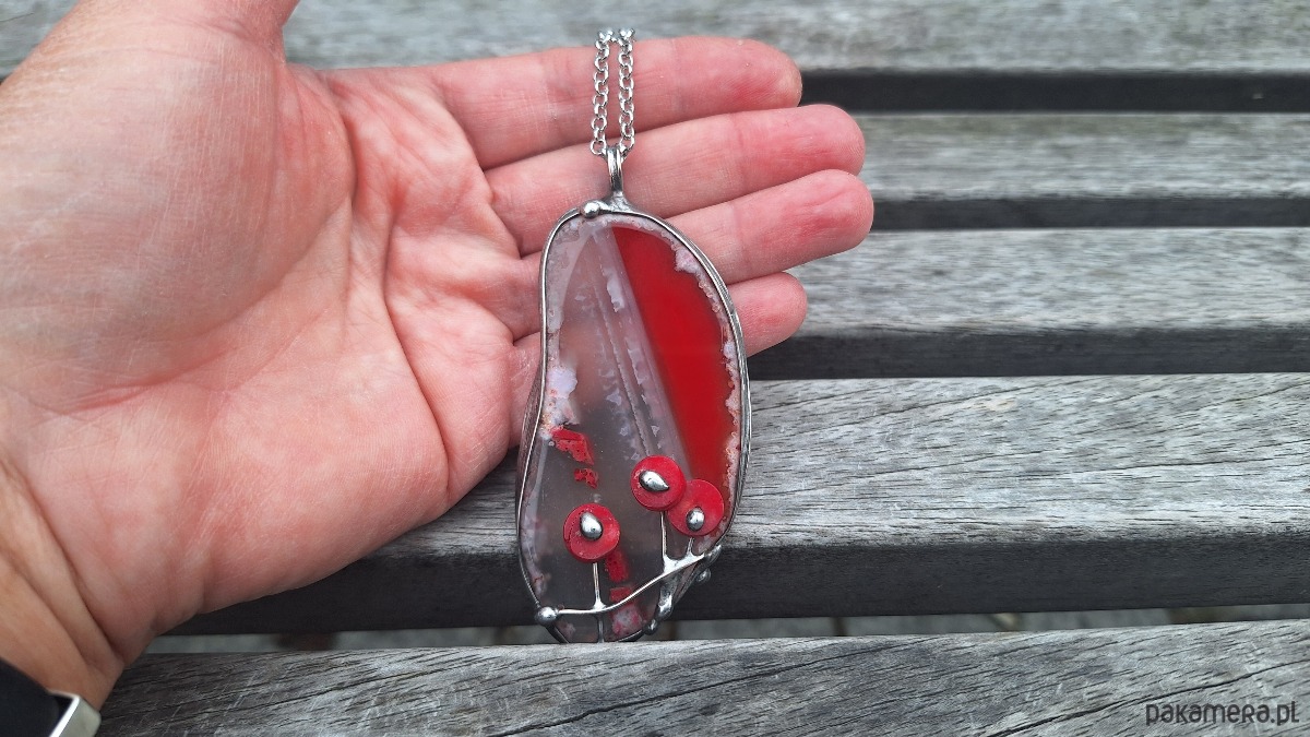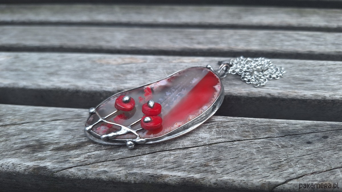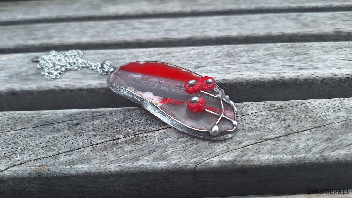 Wisiorek wykonany z miedzi, cyny, koralowców i agatu. Wymiary ok. 8 na 4 cm. Zawieszony na łańcuszku o długości ok. 50 cm.