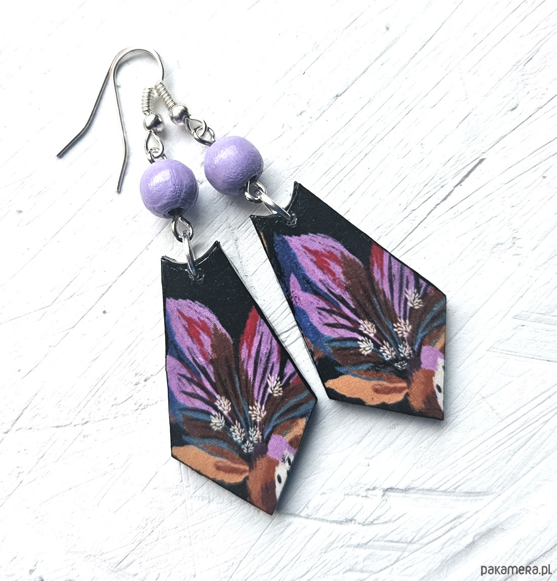 kolczyki drewniane, ozdobione metodą decoupage, dwustronne, starannie wykończone farbami akrylowymi i zabezpieczone wielokrotnie lakierem, koraliki drewniane, bigle posrebrzane, długość kolczyków bez bigli: 5,5 cm, szerokość: 2 cm, bardzo lekkie