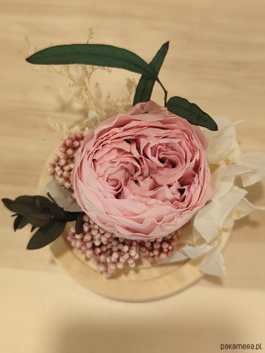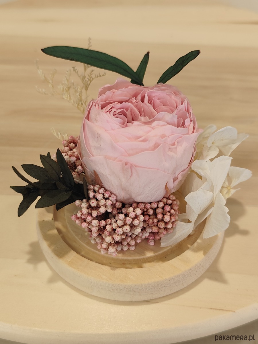 Dekoracja z piwonią pod szklanym kloszem – kwiatowy prezent handmade