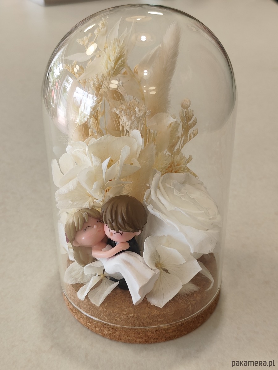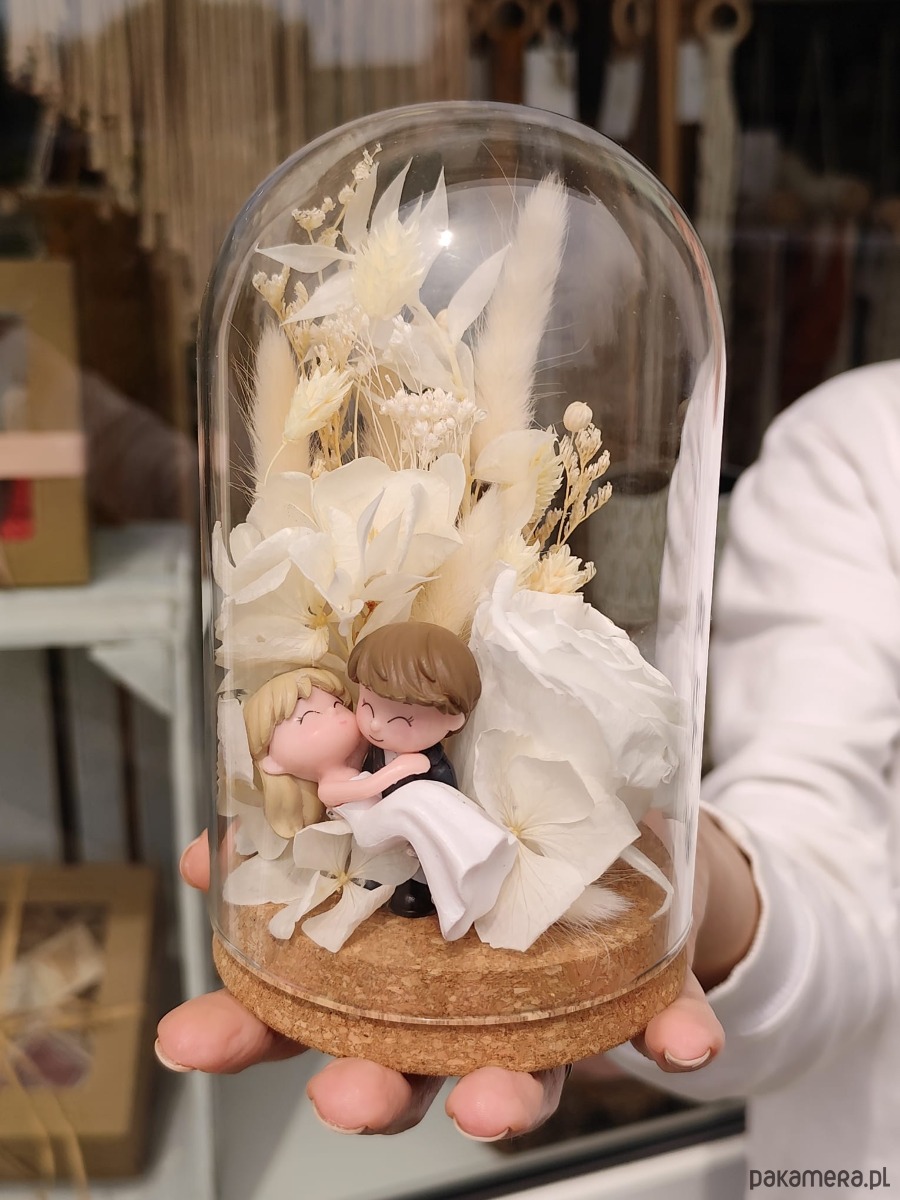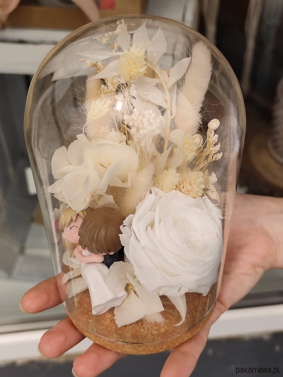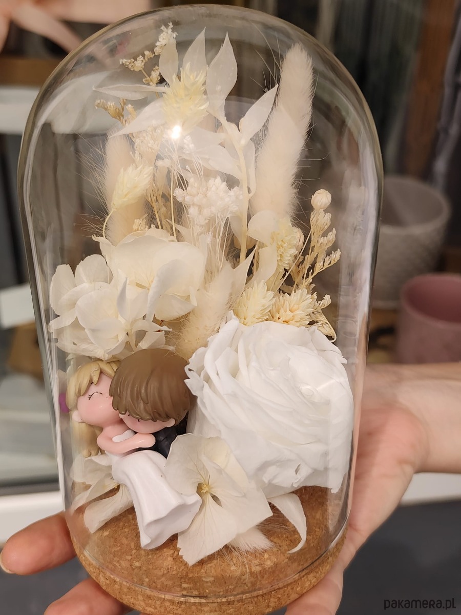 Marzysz o wyjątkowym upominku na ślub lub rocznicę? Nasza ręcznie wykonana kopuła z wieczną różą, suszonymi kwiatami i uroczą figurką pary młodej to niepowtarzalna dekoracja, która oczaruje nowożeńców i stanie się wyjątkową pamiątką tego dnia. Biel kwiatów symbolizuje czystość i elegancję, a figurka wprowadza nutę romantyzmu i radości.