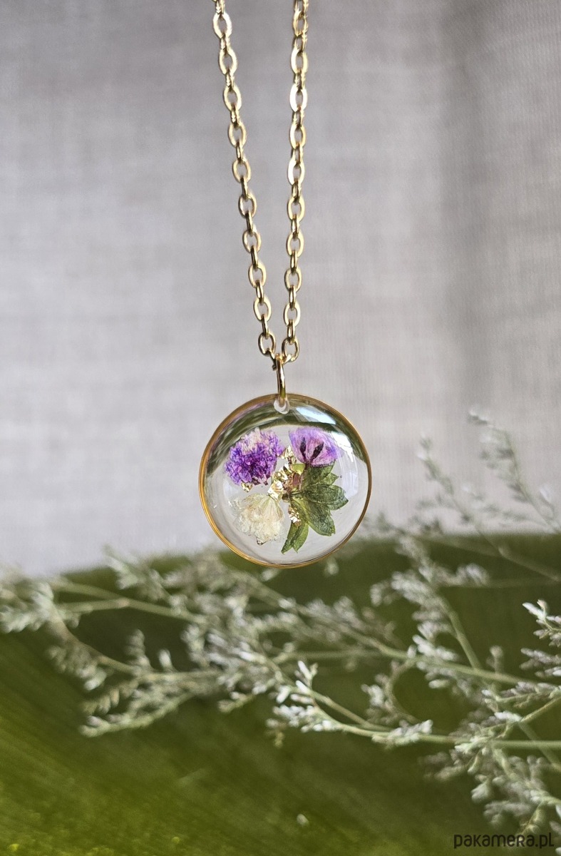 Oferuję Państwu unikalną biżuterię. Zawieszka jest wykonana z suszonych kwiatów i żywicy epoksydowej. Biżuteria jest wspaniałym i oryginalnym prezentem na lata.