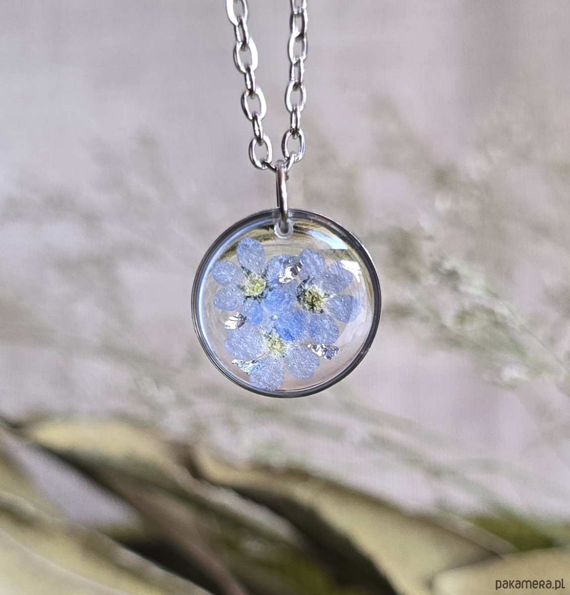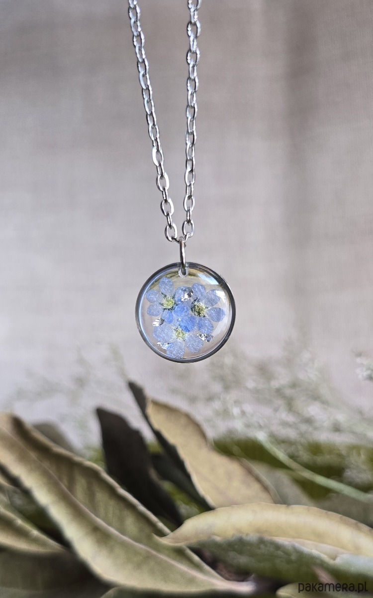 Oferuję Państwu unikalną biżuterię. Zawieszka jest wykonana z suszonych kwiatów i żywicy epoksydowej. Biżuteria jest wspaniałym i oryginalnym prezentem na lata.