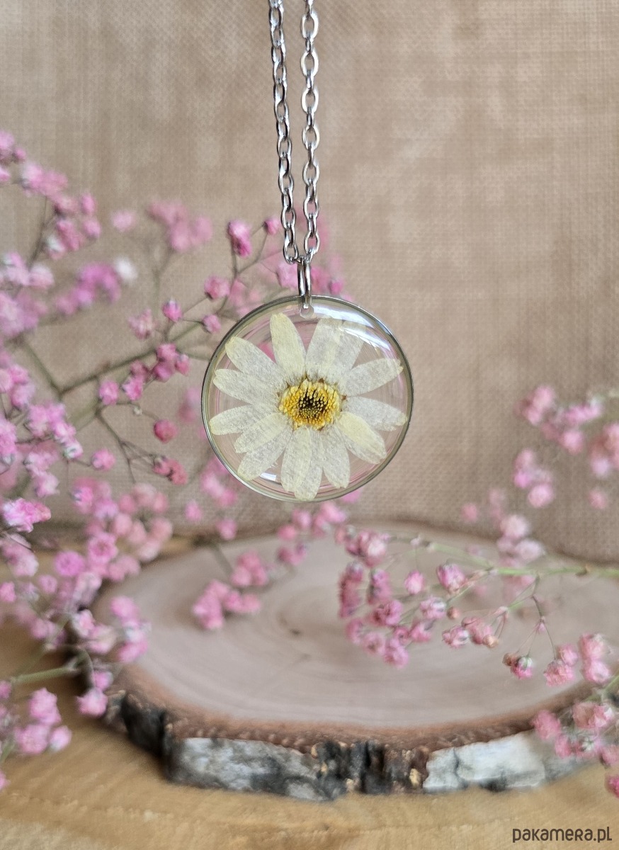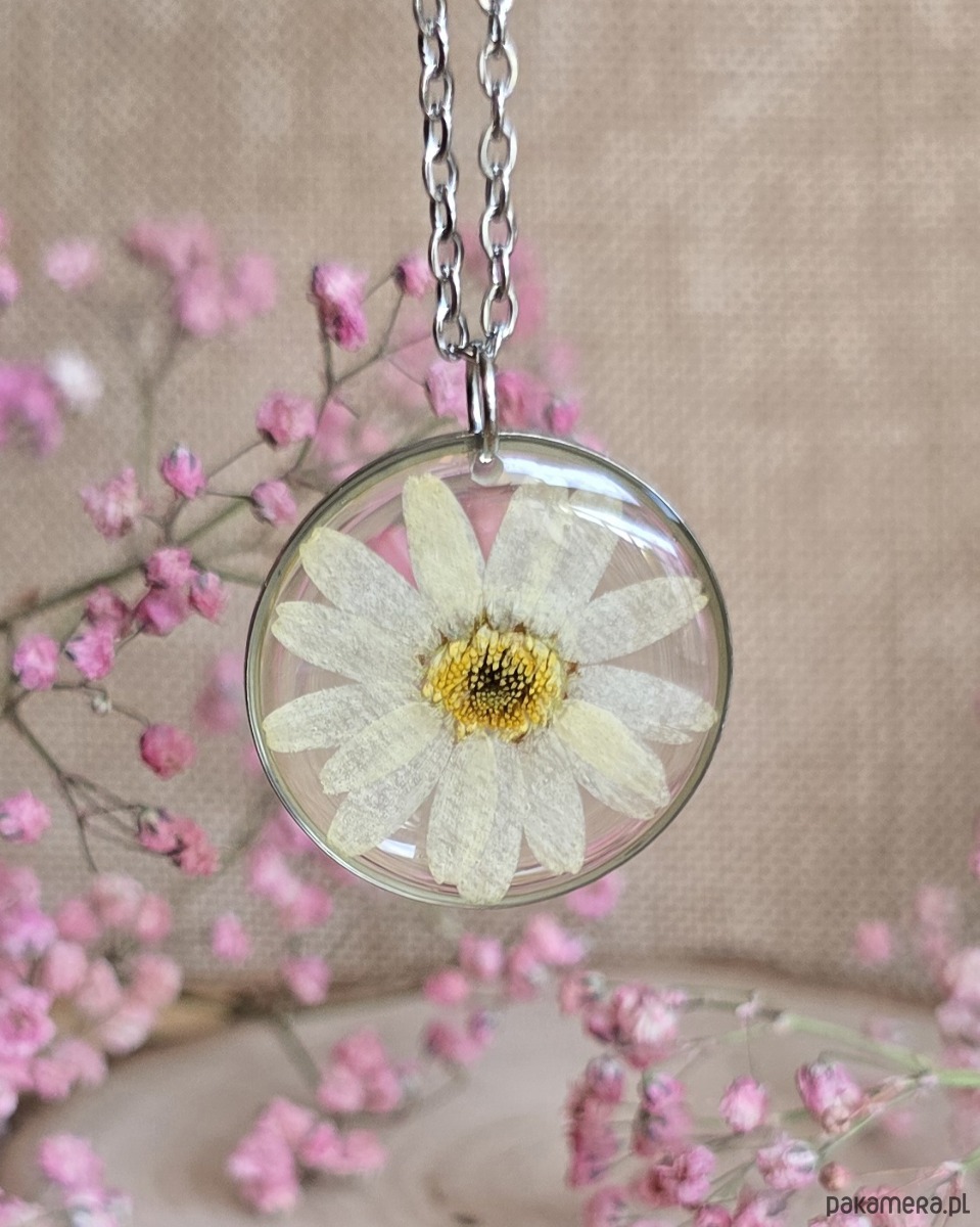 Oferuję Państwu unikalną biżuterię. Zawieszka jest wykonana z suszonych kwiatów i żywicy epoksydowej. Biżuteria jest wspaniałym i oryginalnym prezentem na lata.