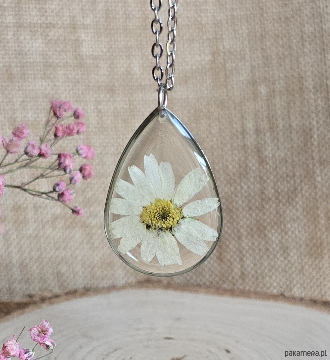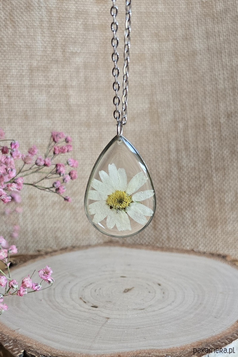 Oferuję Państwu unikalną biżuterię. Zawieszka jest wykonana z suszonych kwiatów i żywicy epoksydowej. Biżuteria jest wspaniałym i oryginalnym prezentem na lata.