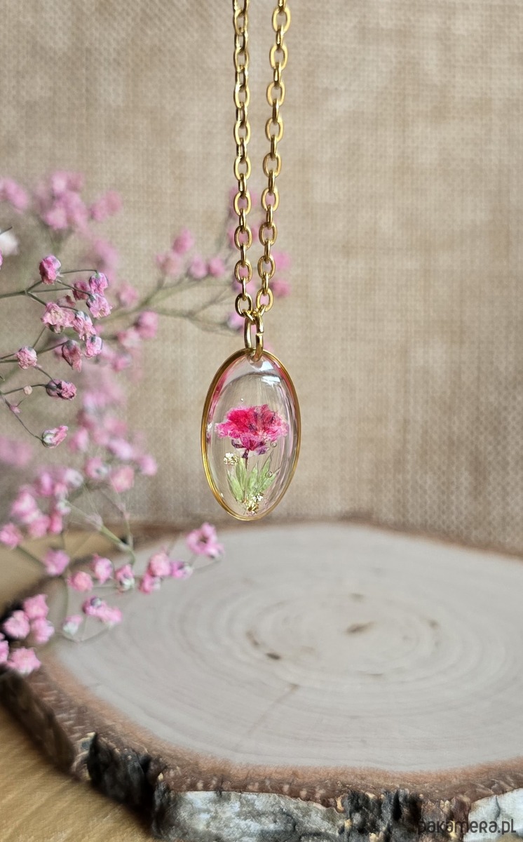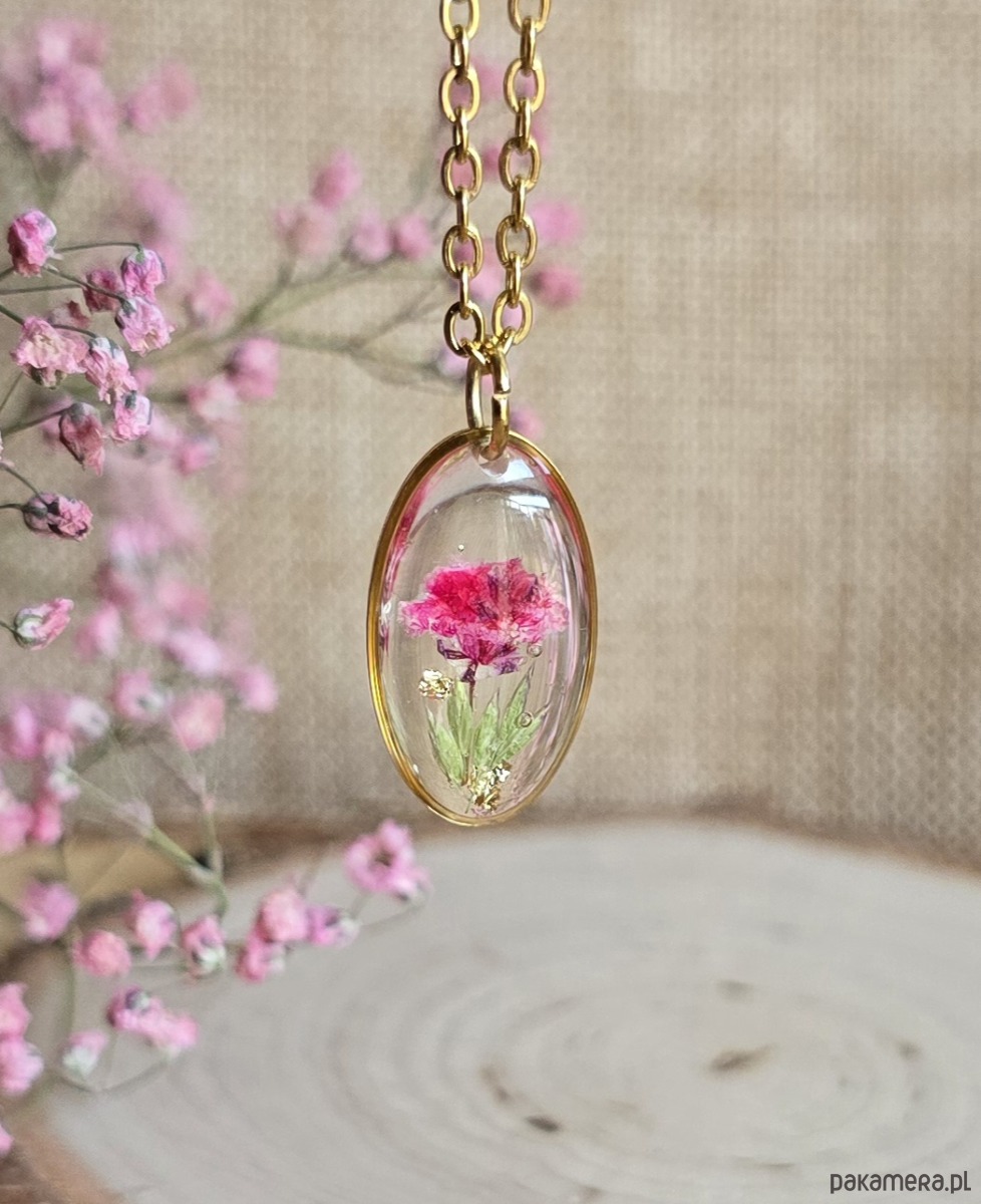 Oferuję Państwu unikalną biżuterię. Zawieszka jest wykonana z suszonych kwiatów i żywicy epoksydowej. Biżuteria jest wspaniałym i oryginalnym prezentem na lata.