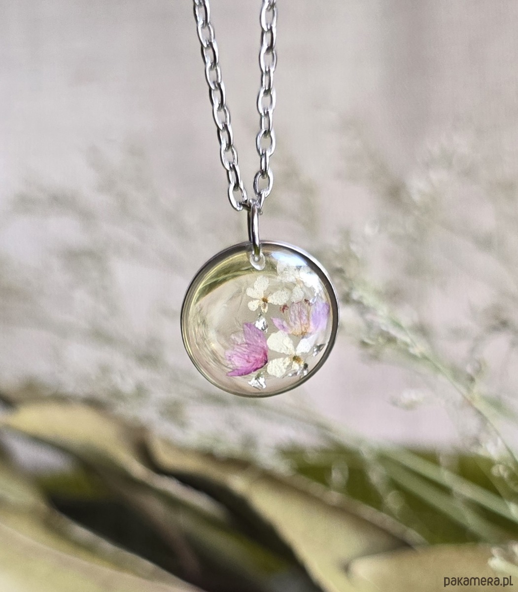 Oferuję Państwu unikalną biżuterię. Zawieszka jest wykonana z suszonych kwiatów i żywicy epoksydowej. Biżuteria jest wspaniałym i oryginalnym prezentem na lata.