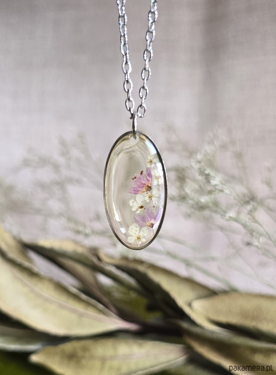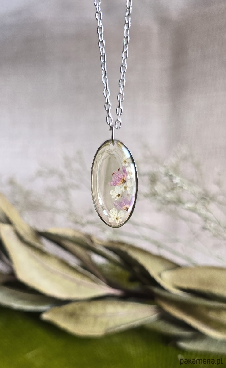 Oferuję Państwu unikalną biżuterię. Zawieszka jest wykonana z suszonych kwiatów i żywicy epoksydowej. Biżuteria jest wspaniałym i oryginalnym prezentem na lata.