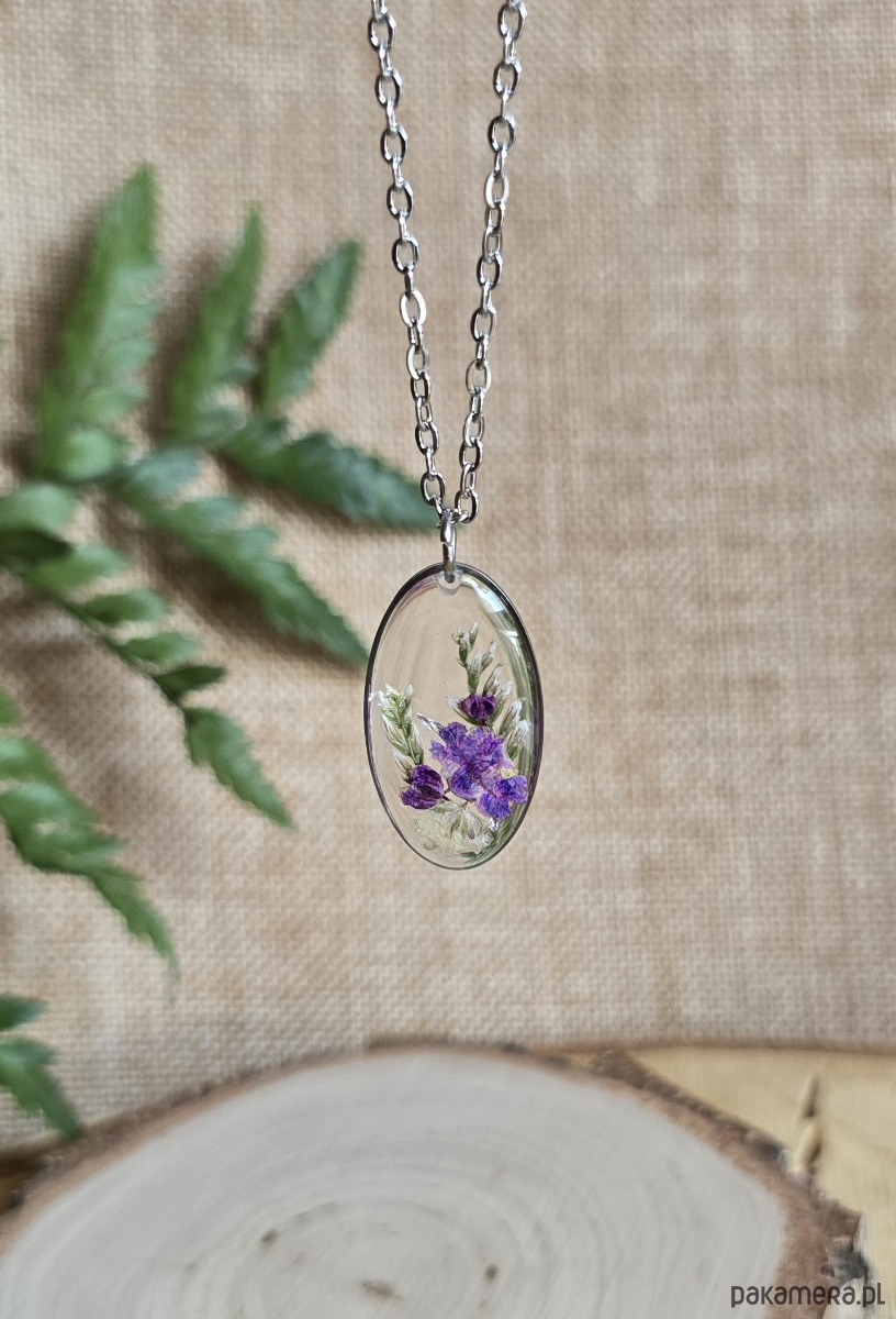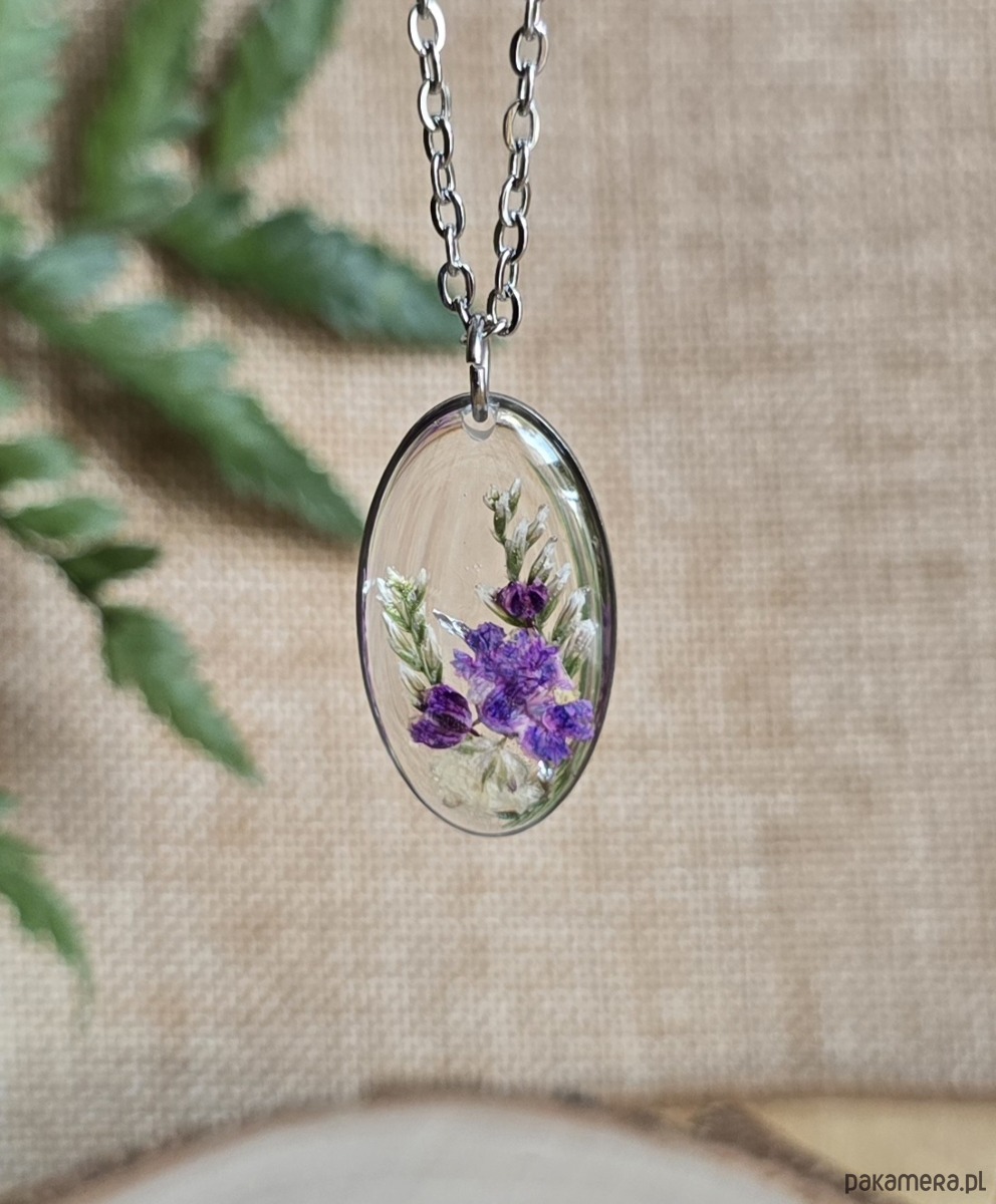 Oferuję Państwu unikalną biżuterię. Zawieszka jest wykonana z suszonych kwiatów i żywicy epoksydowej. Biżuteria jest wspaniałym i oryginalnym prezentem na lata.