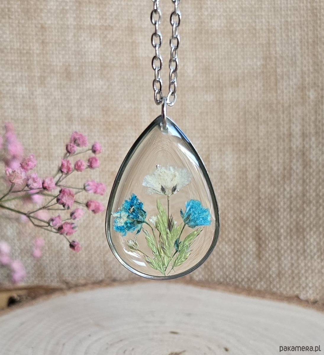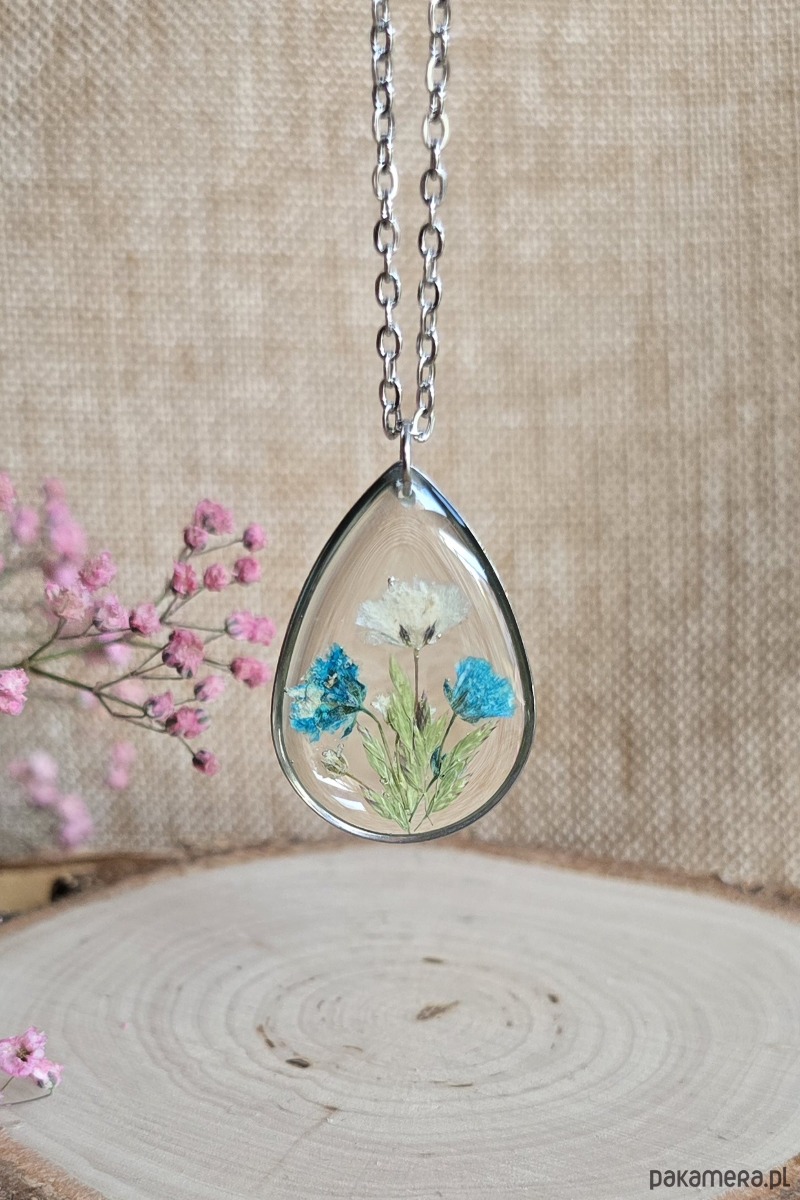 Oferuję Państwu unikalną biżuterię. Zawieszka jest wykonana z suszonych kwiatów i żywicy epoksydowej. Biżuteria jest wspaniałym i oryginalnym prezentem na lata.