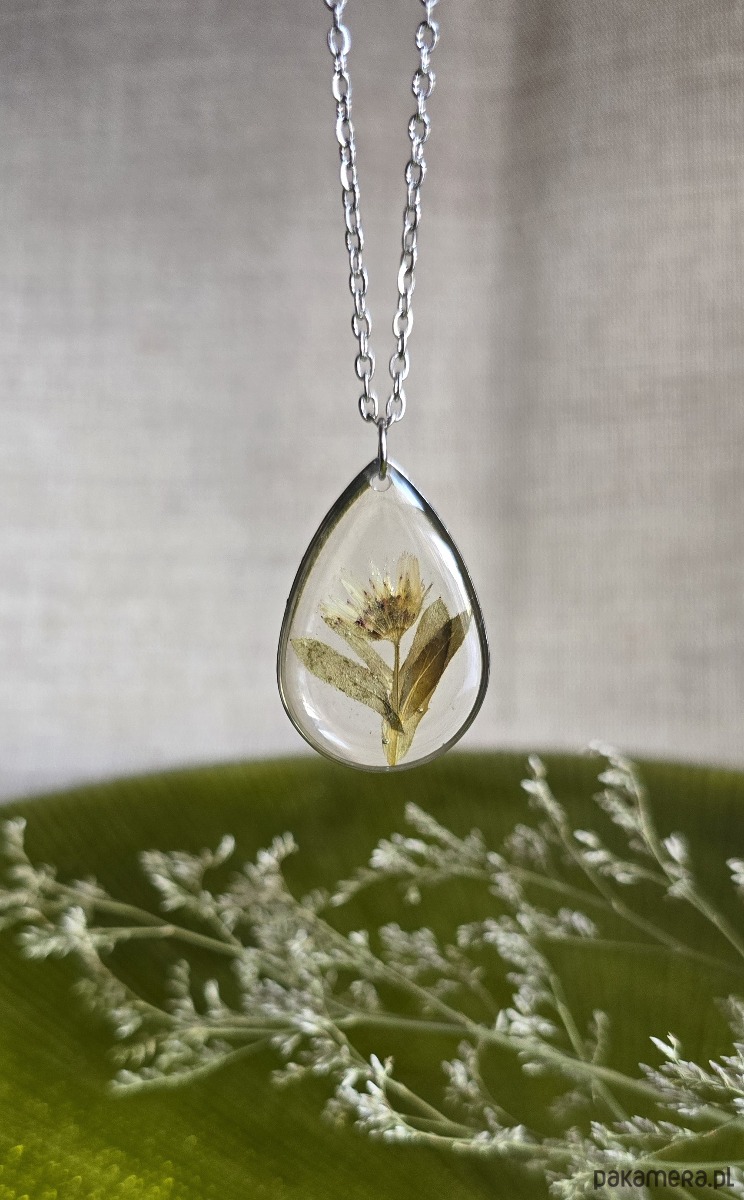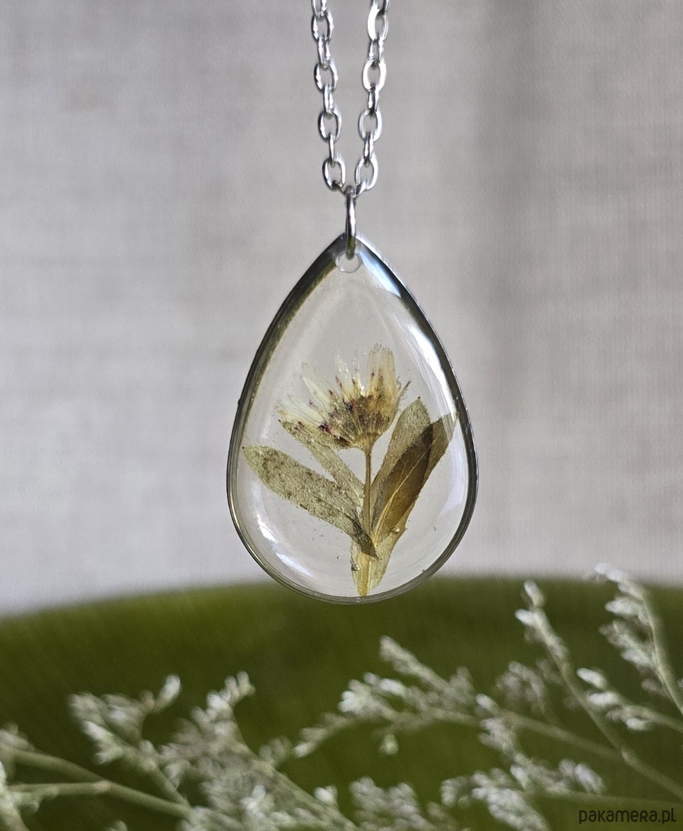 Oferuję Państwu unikalną biżuterię. Zawieszka jest wykonana z suszonych kwiatów i żywicy epoksydowej. Biżuteria jest wspaniałym i oryginalnym prezentem na lata.