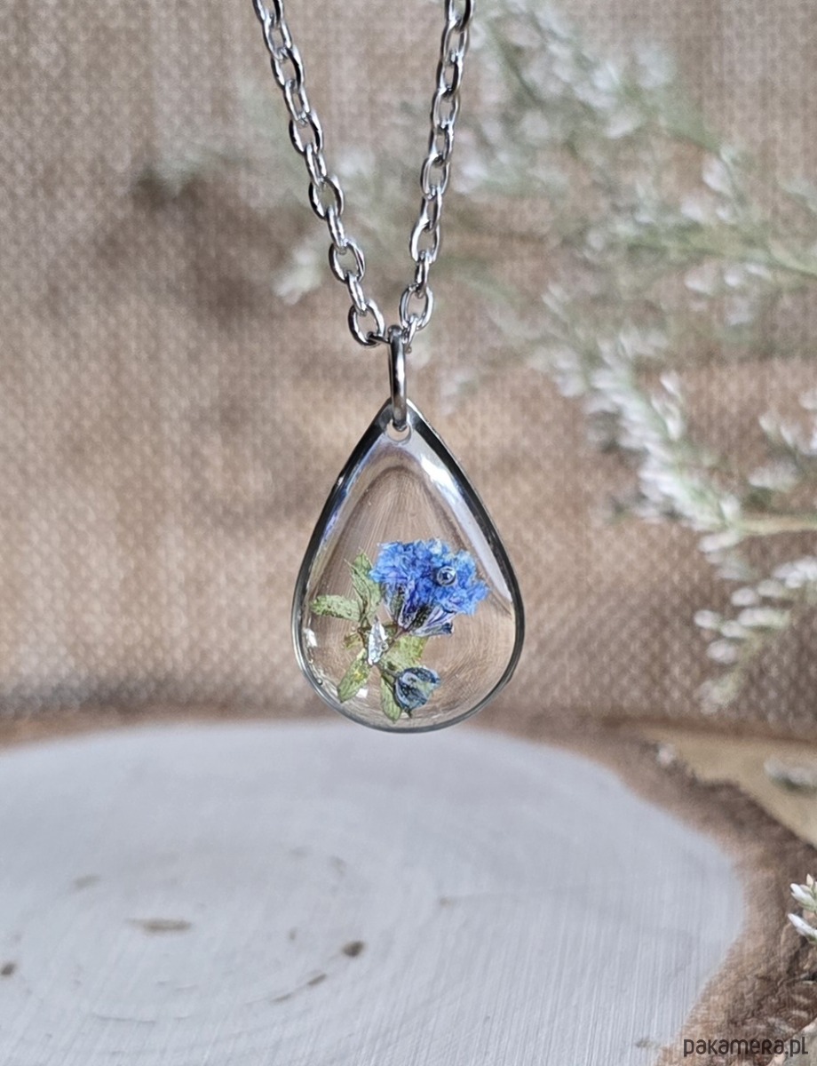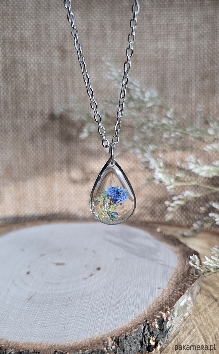 Oferuję Państwu unikalną biżuterię. Zawieszka jest wykonana z suszonych kwiatów i żywicy epoksydowej. Biżuteria jest wspaniałym i oryginalnym prezentem na lata.