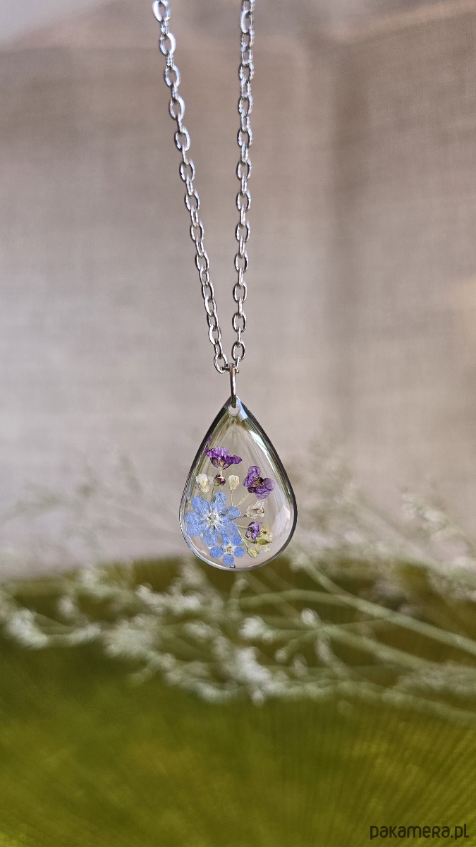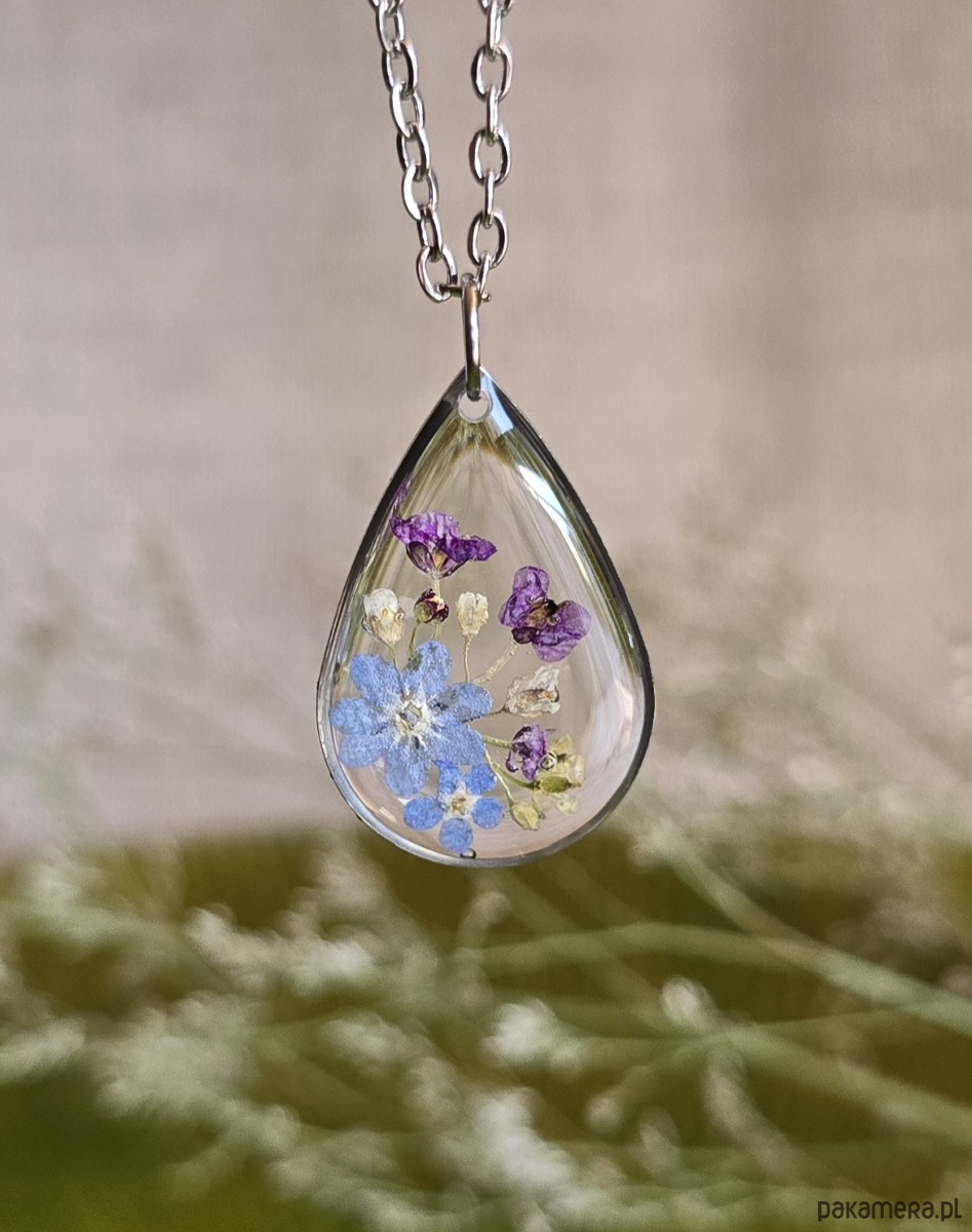 Oferuję Państwu unikalną biżuterię. Zawieszka jest wykonana z suszonych kwiatów i żywicy epoksydowej. Biżuteria jest wspaniałym i oryginalnym prezentem na lata.