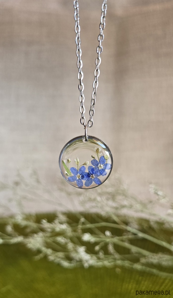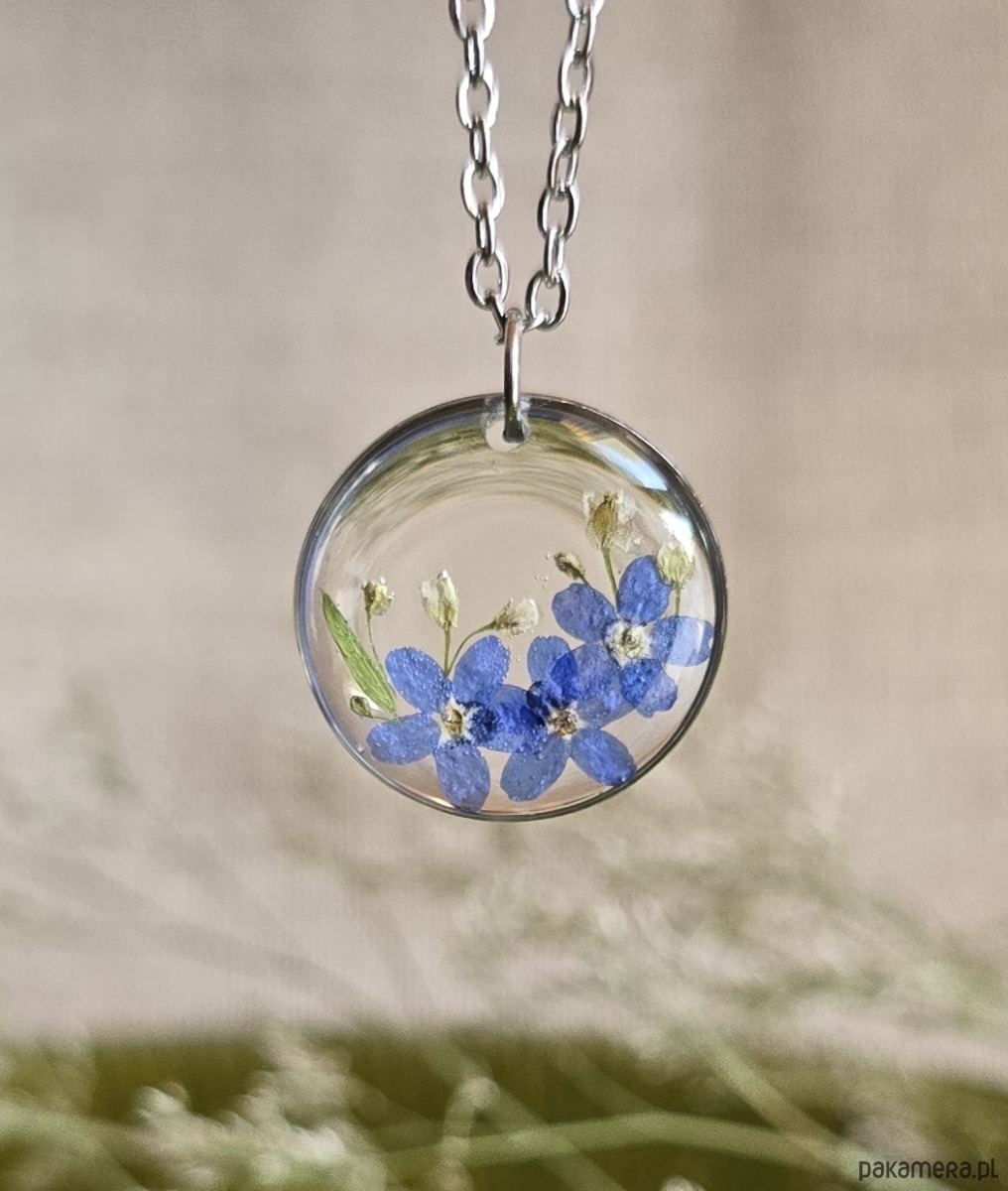Oferuję Państwu unikalną biżuterię. Zawieszka jest wykonana z suszonych kwiatów i żywicy epoksydowej. Biżuteria jest wspaniałym i oryginalnym prezentem na lata.