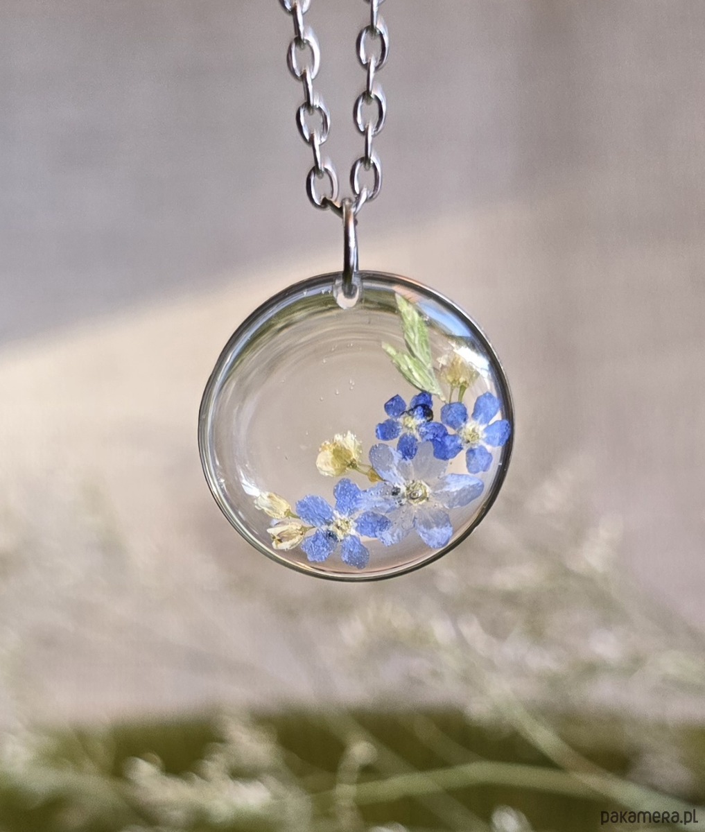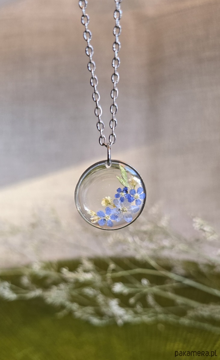 Oferuję Państwu unikalną biżuterię. Zawieszka jest wykonana z suszonych kwiatów i żywicy epoksydowej. Biżuteria jest wspaniałym i oryginalnym prezentem na lata.