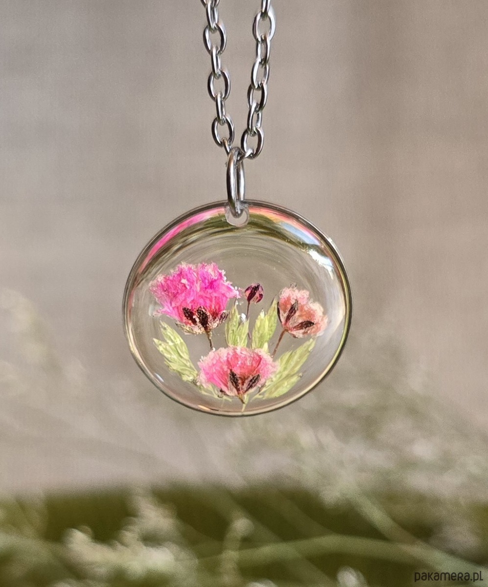 Oferuję Państwu unikalną biżuterię. Zawieszka jest wykonana z suszonych kwiatów i żywicy epoksydowej. Biżuteria jest wspaniałym i oryginalnym prezentem na lata.
