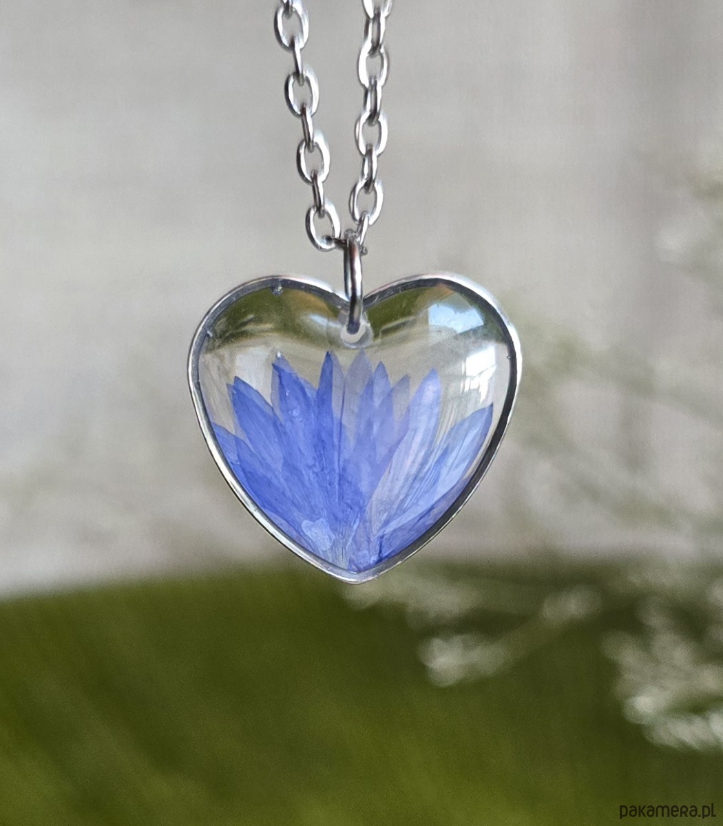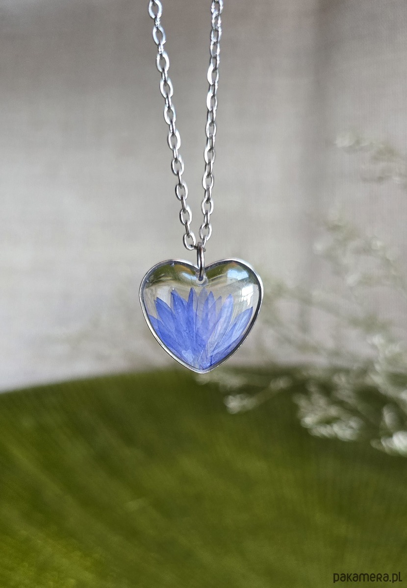 Wieczne kwiaty srebrny wisiorek prawdziwe kwiaty serce serduszko chaber chabry