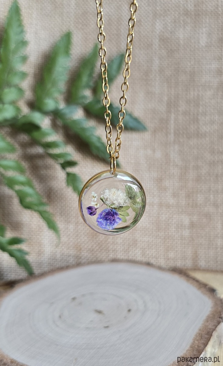 Oferuję Państwu unikalną biżuterię. Zawieszka jest wykonana z suszonych kwiatów i żywicy epoksydowej. Biżuteria jest wspaniałym i oryginalnym prezentem na lata.