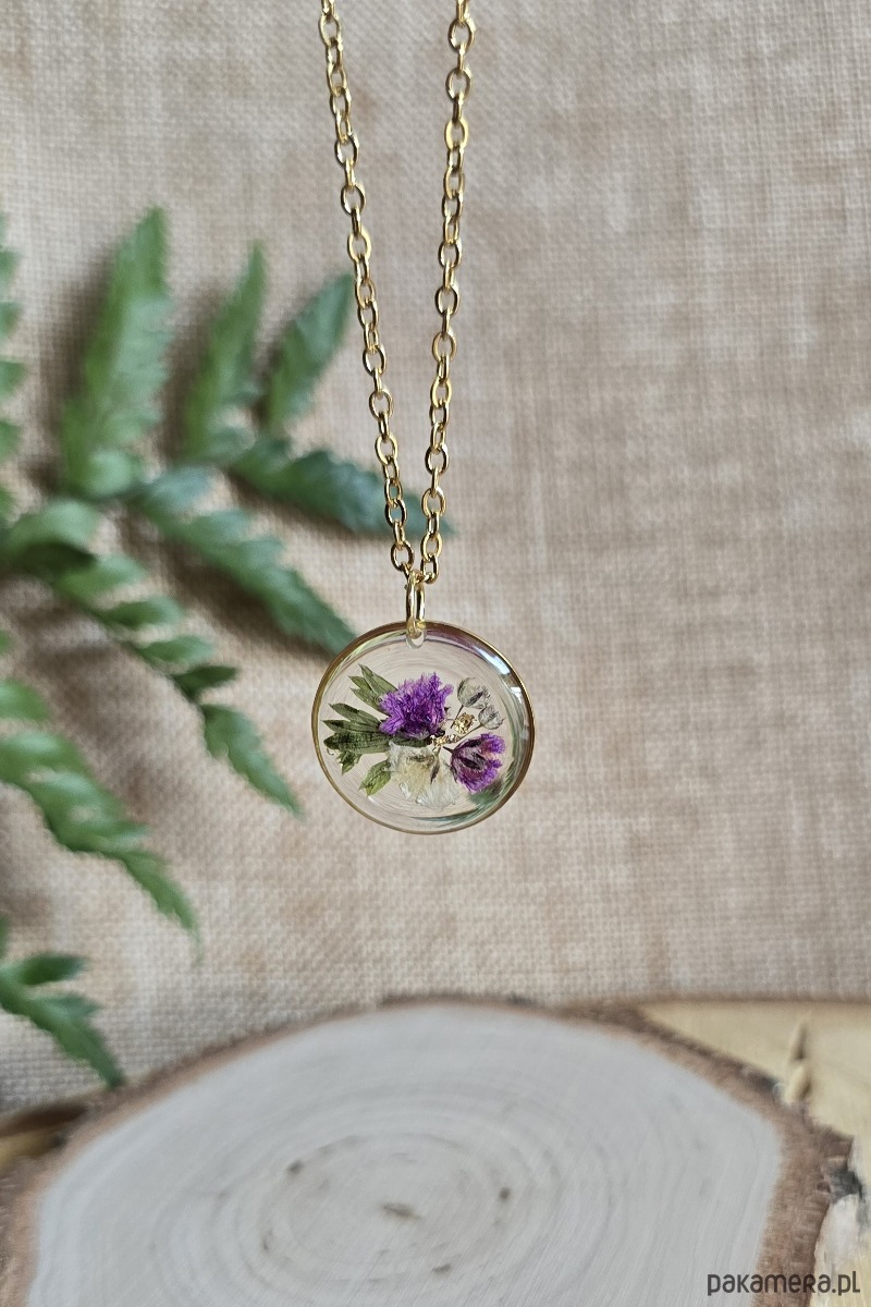 Oferuję Państwu unikalną biżuterię. Zawieszka jest wykonana z suszonych kwiatów i żywicy epoksydowej. Biżuteria jest wspaniałym i oryginalnym prezentem na lata.