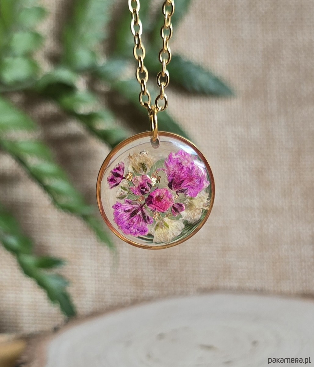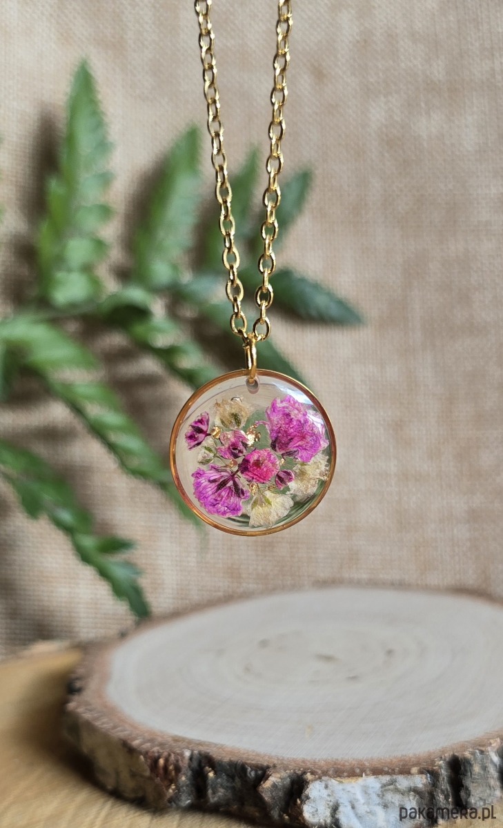 Oferuję Państwu unikalną biżuterię. Zawieszka jest wykonana z suszonych kwiatów i żywicy epoksydowej. Biżuteria jest wspaniałym i oryginalnym prezentem na lata.
