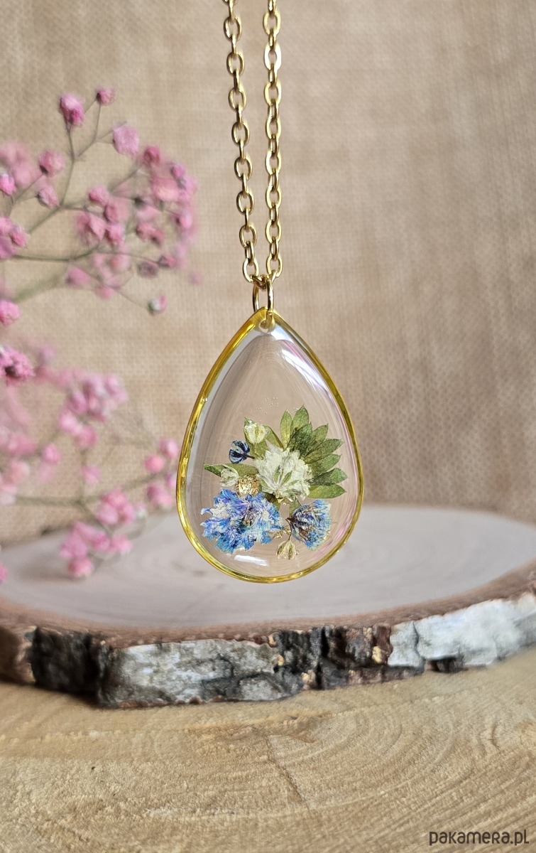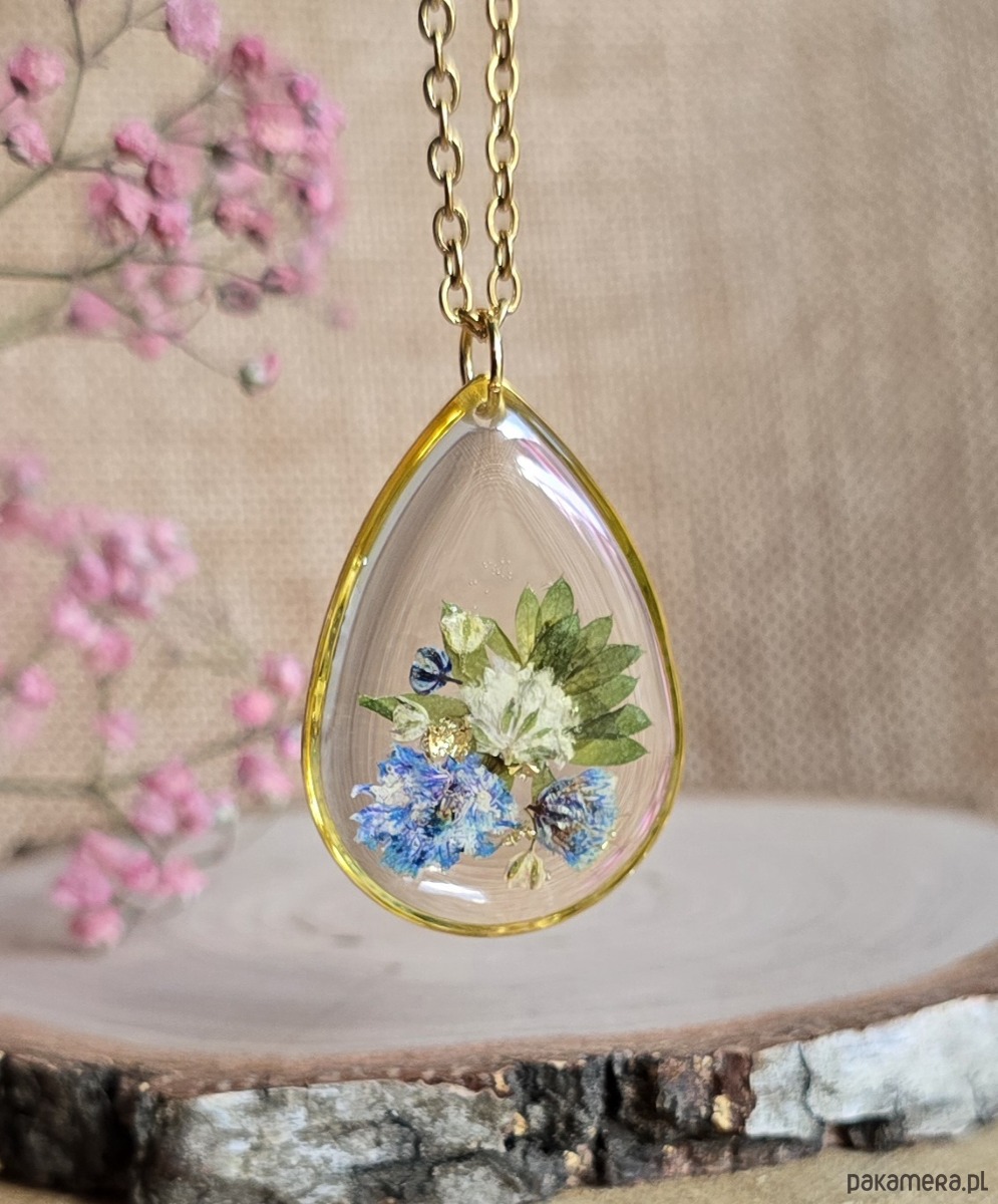 Oferuję Państwu unikalną biżuterię. Zawieszka jest wykonana z suszonych kwiatów i żywicy epoksydowej. Biżuteria jest wspaniałym i oryginalnym prezentem na lata.