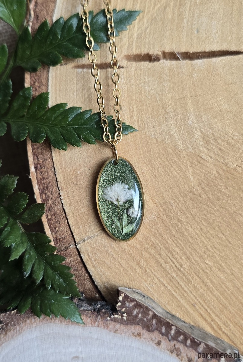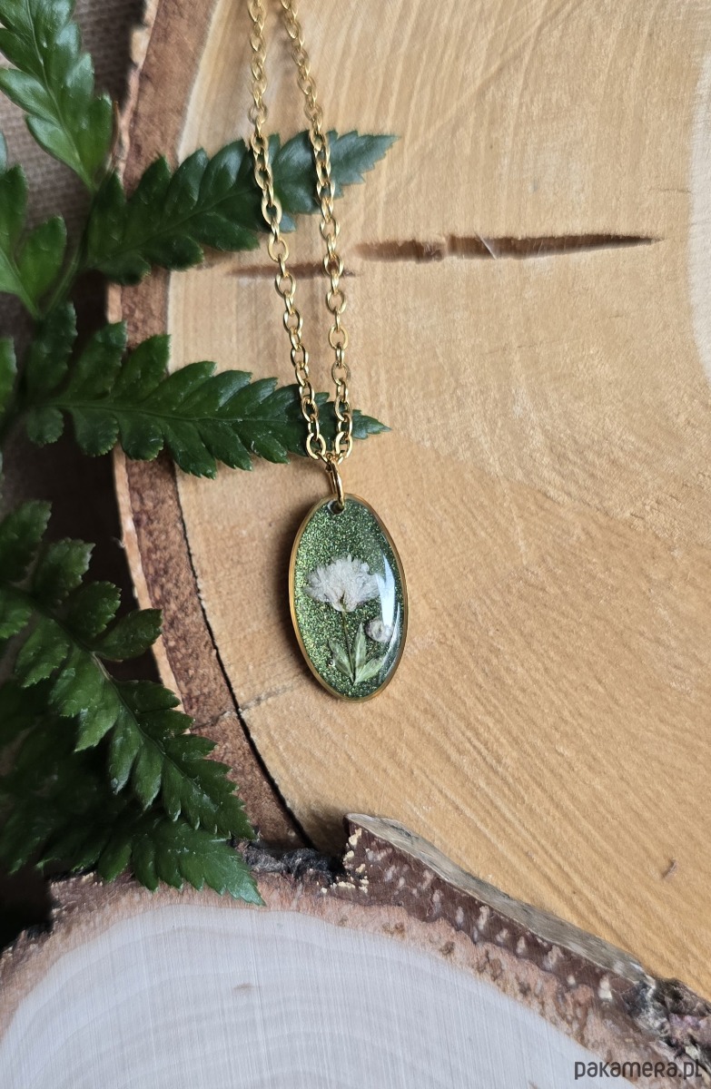 Oferuję Państwu unikalną biżuterię. Zawieszka jest wykonana z suszonych kwiatów i żywicy epoksydowej. Biżuteria jest wspaniałym i oryginalnym prezentem na lata.