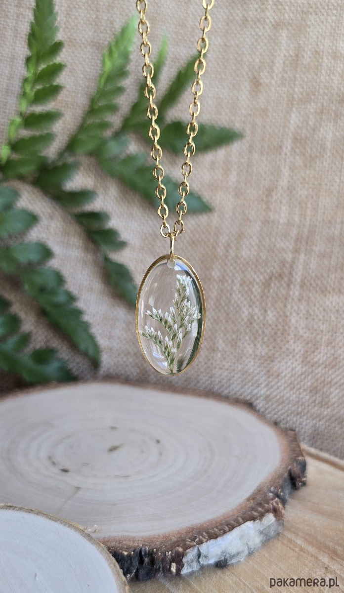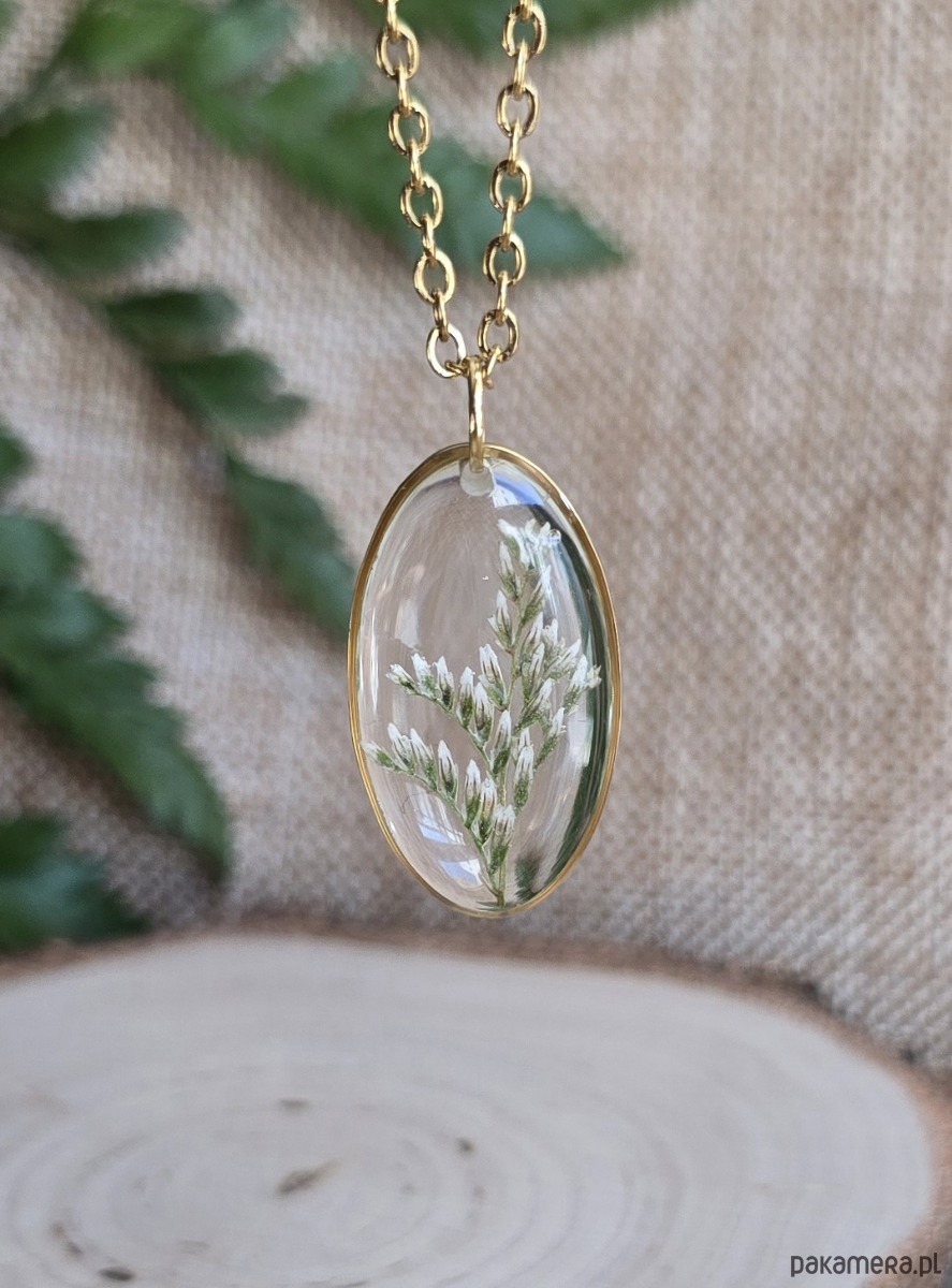 Oferuję Państwu unikalną biżuterię. Zawieszka jest wykonana z suszonych kwiatów i żywicy epoksydowej. Biżuteria jest wspaniałym i oryginalnym prezentem na lata.