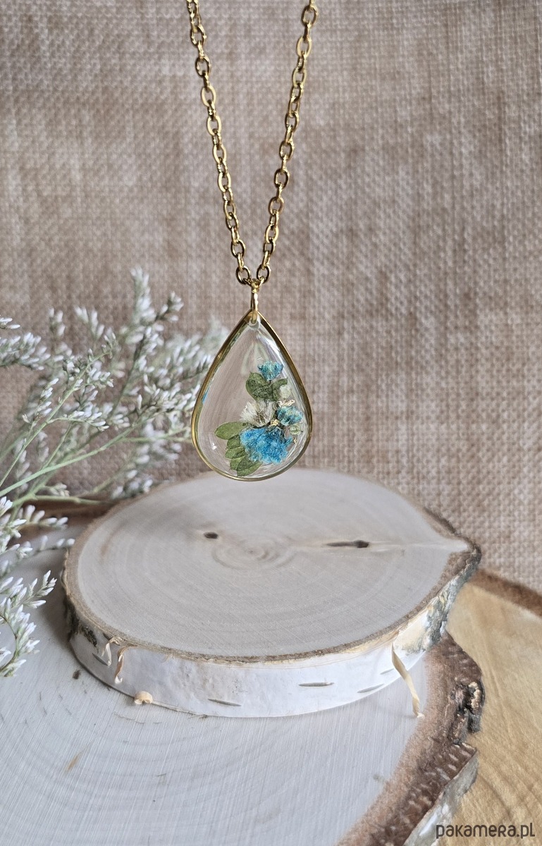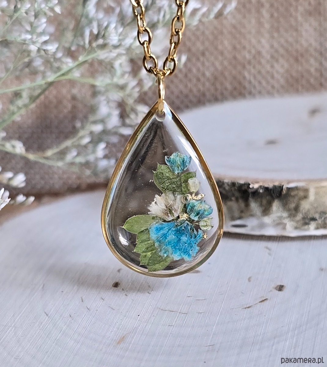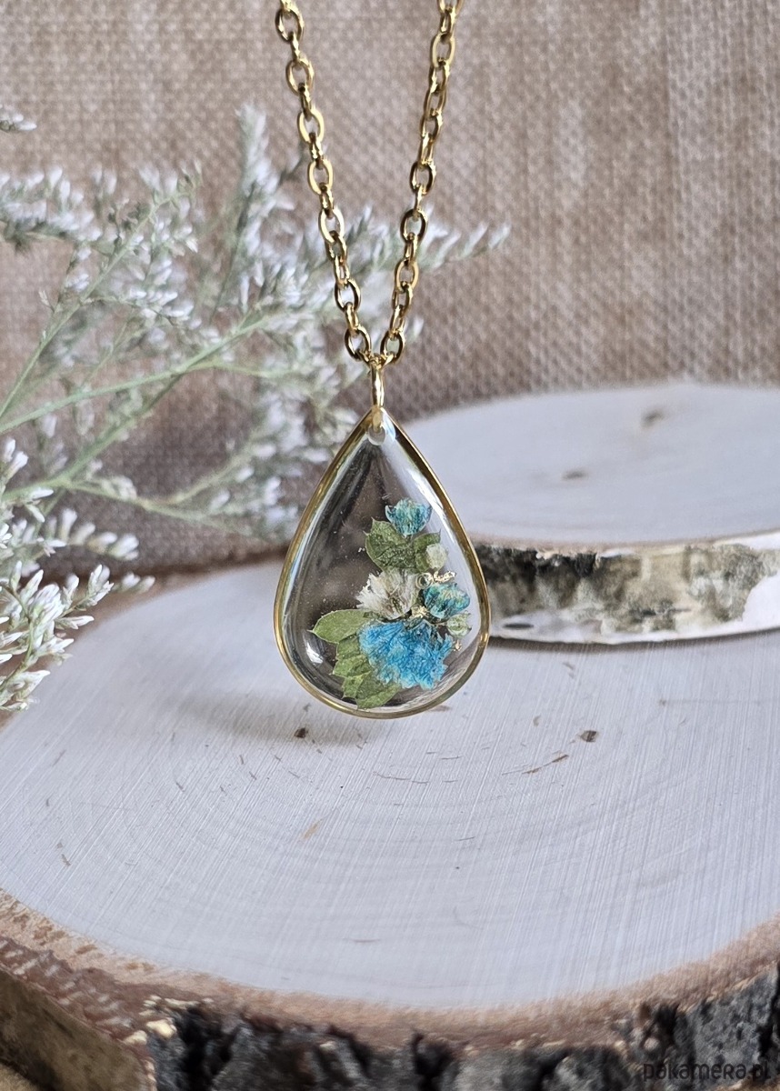 Oferuję Państwu unikalną biżuterię. Zawieszka jest wykonana z suszonych kwiatów i żywicy epoksydowej. Biżuteria jest wspaniałym i oryginalnym prezentem na lata.