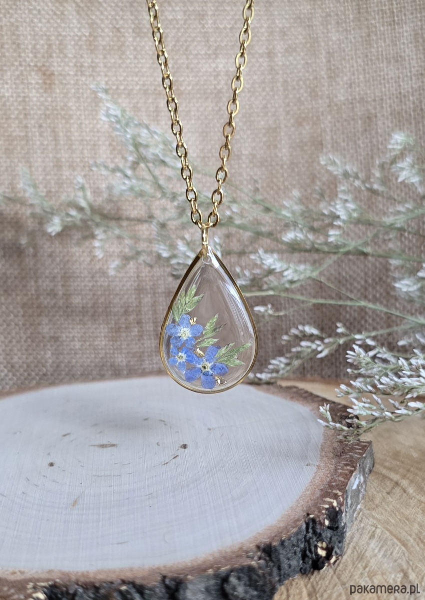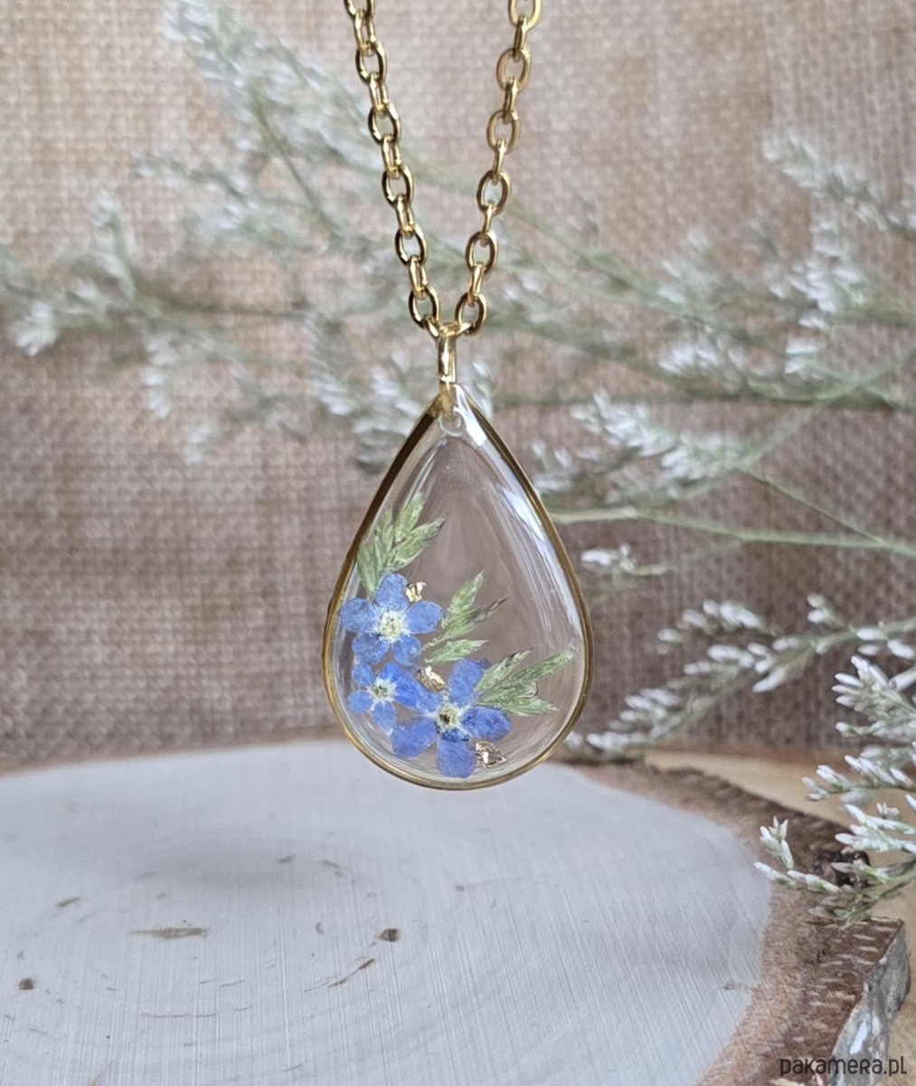 Oferuję Państwu unikalną biżuterię. Zawieszka jest wykonana z suszonych kwiatów i żywicy epoksydowej. Biżuteria jest wspaniałym i oryginalnym prezentem na lata.