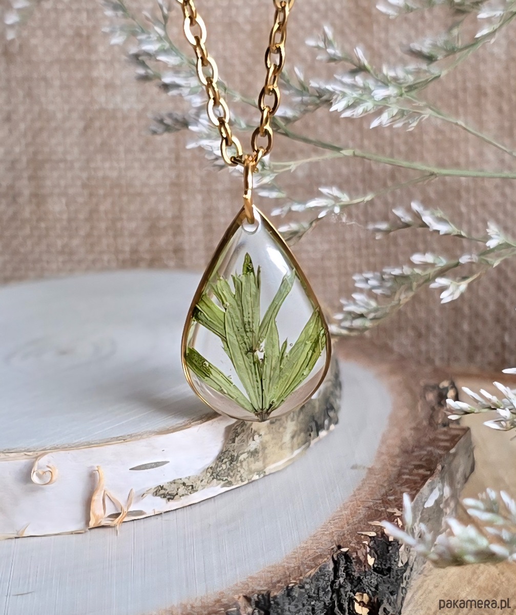 Wieczne kwiaty złoty wisiorek prawdziwe kwiaty naszyjnik zielone listki