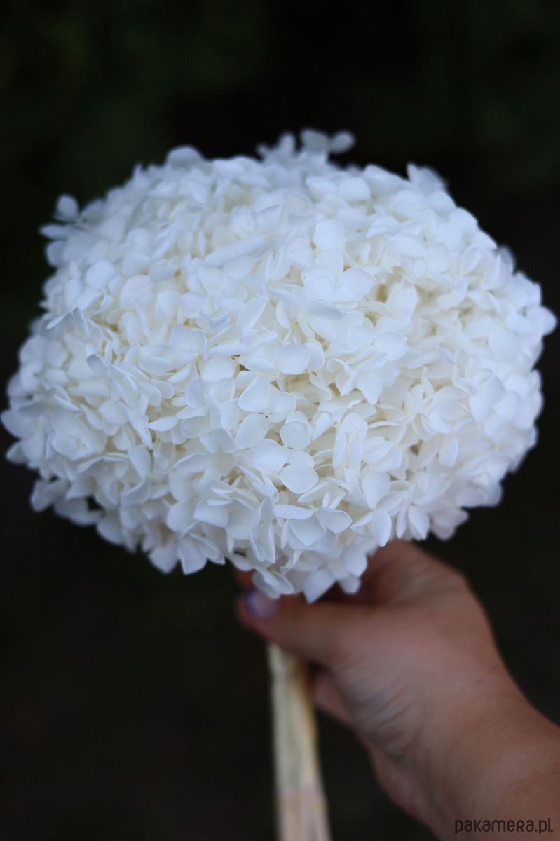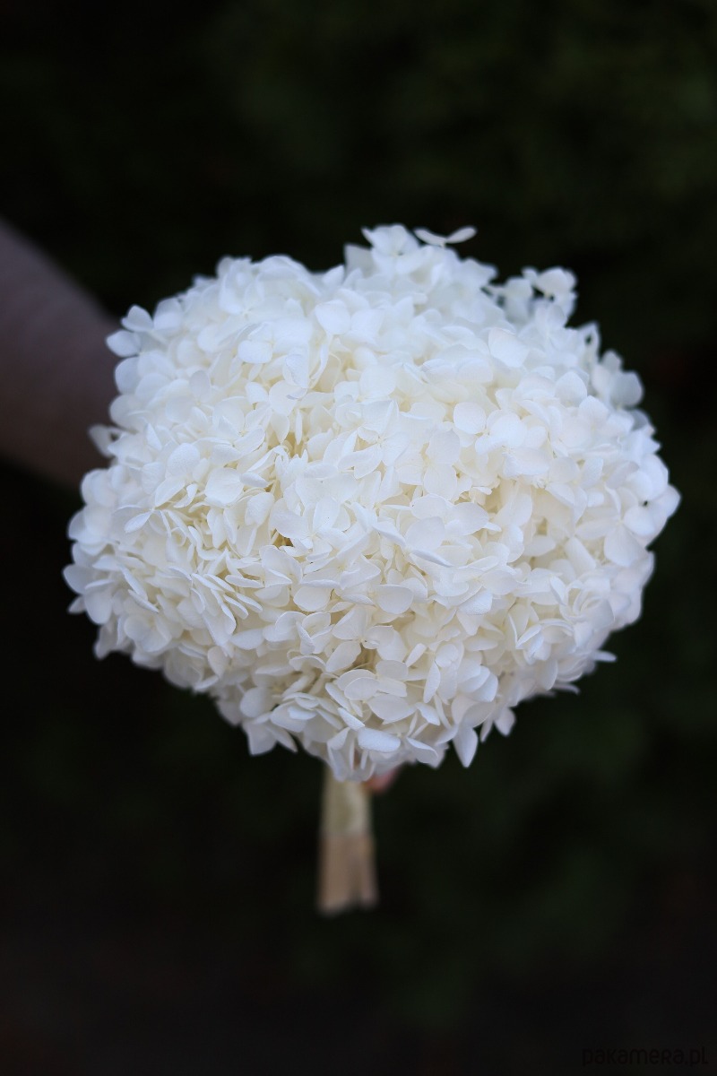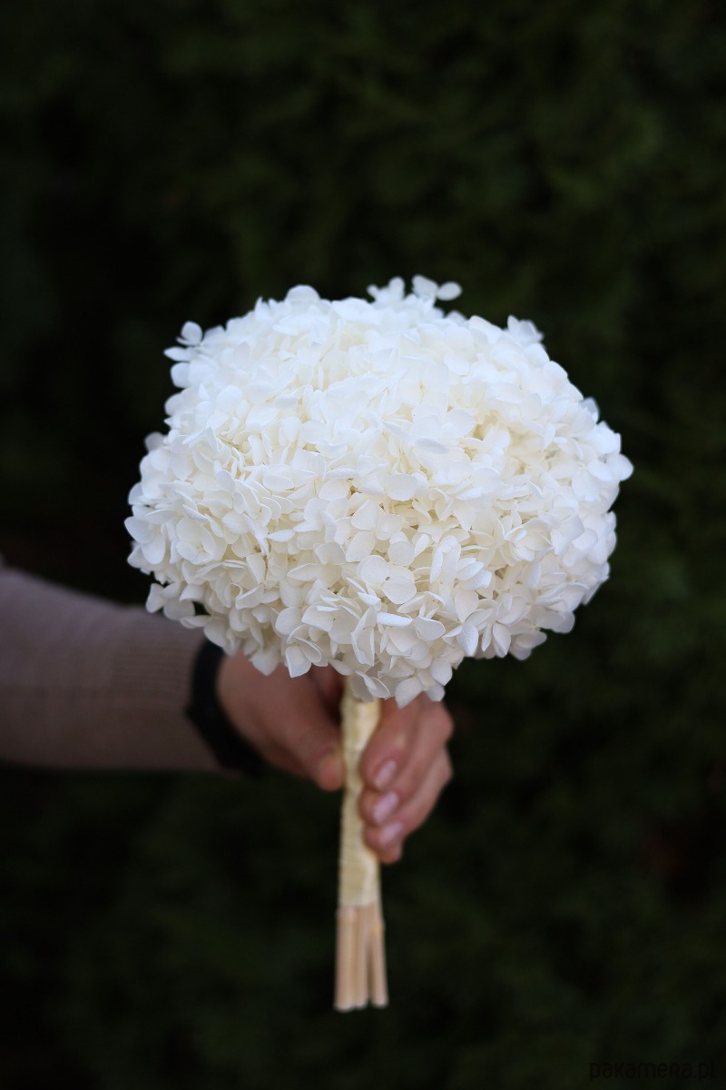 Wieczny bukiet ślubny, wykonany w całości z delikatnej, białej stabilizowanej hortensji. Prosty, a zarazem efektowny — idealnie podkreśli subtelność i wyjątkowość stylizacji Panny Młodej.
