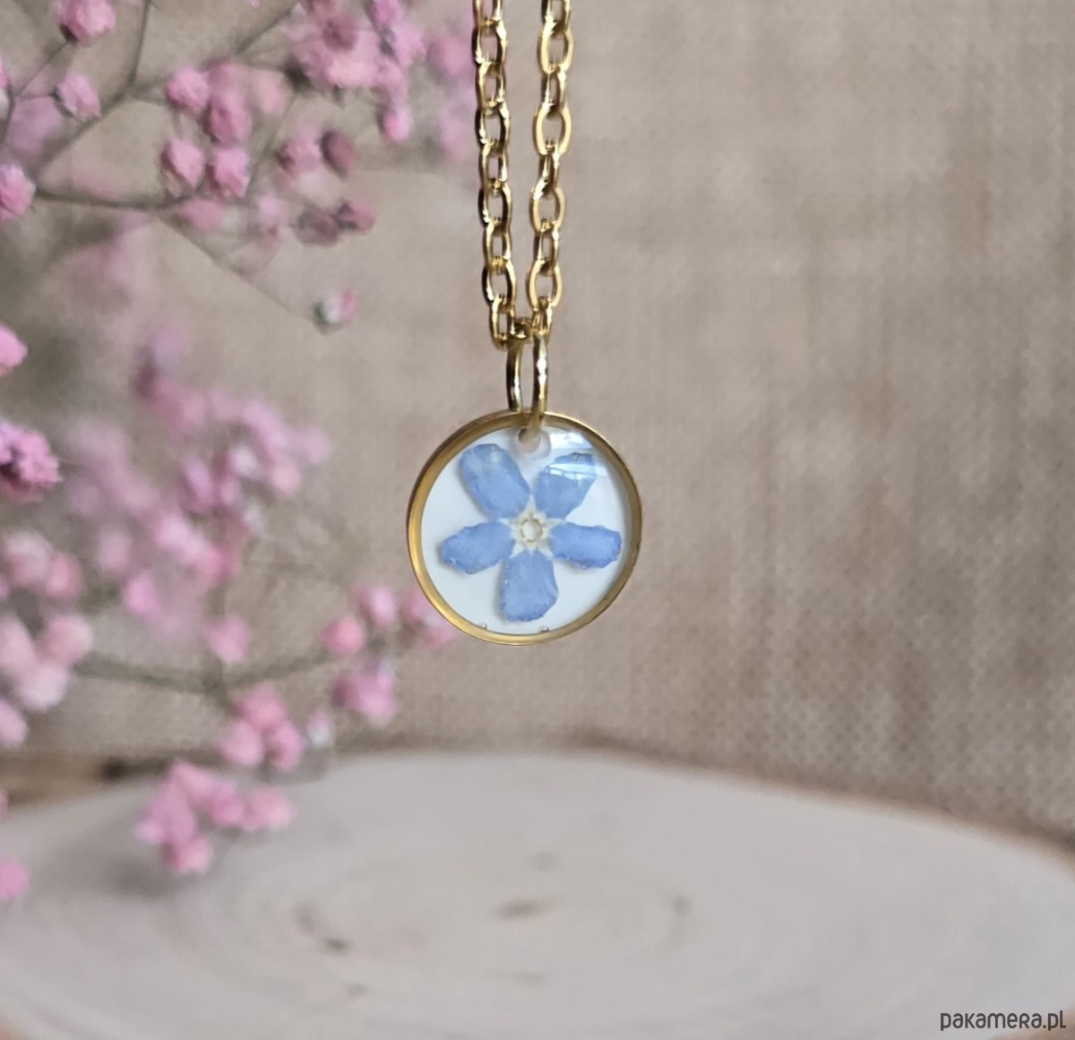 Oferuję Państwu unikalną biżuterię. Zawieszka jest wykonana z suszonych kwiatów i żywicy epoksydowej. Biżuteria jest wspaniałym i oryginalnym prezentem na lata.