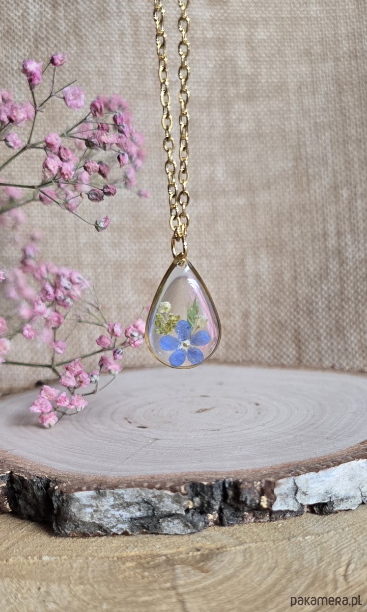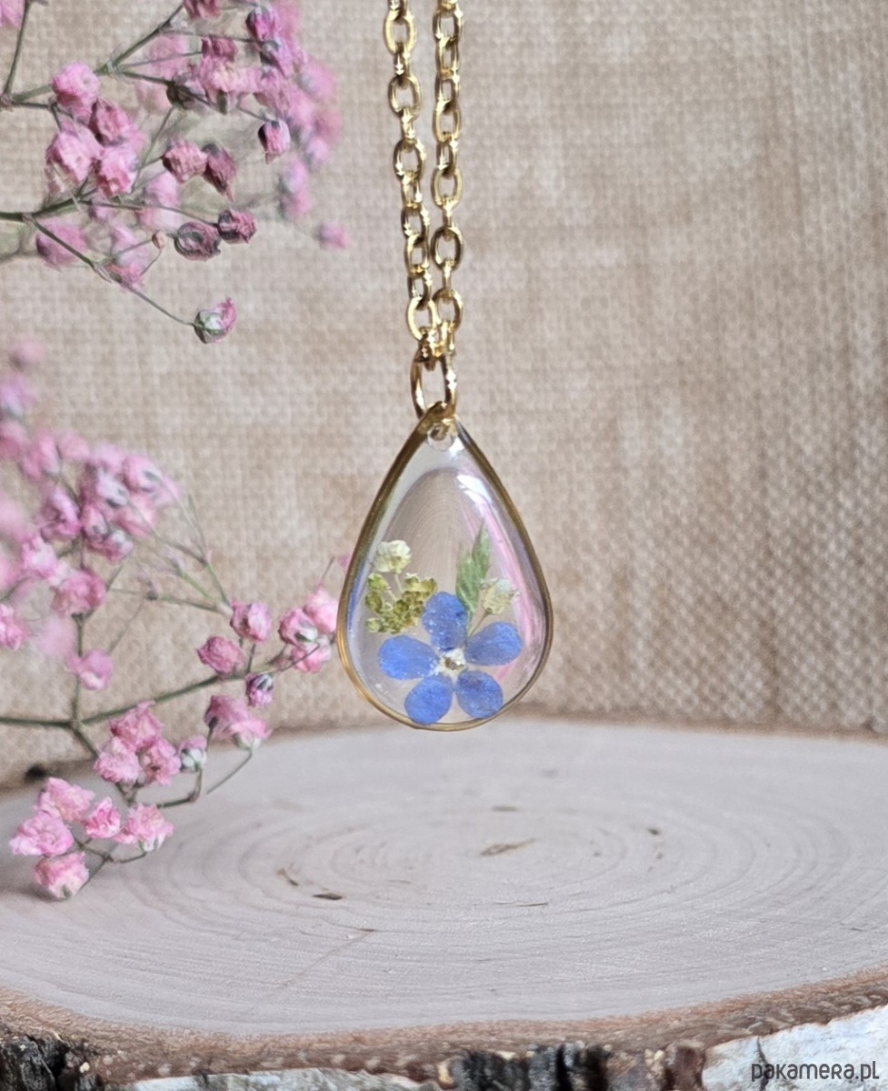Oferuję Państwu unikalną biżuterię. Zawieszka jest wykonana z suszonych kwiatów i żywicy epoksydowej. Biżuteria jest wspaniałym i oryginalnym prezentem na lata.