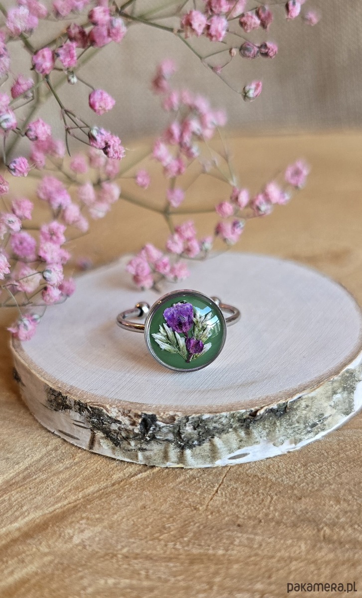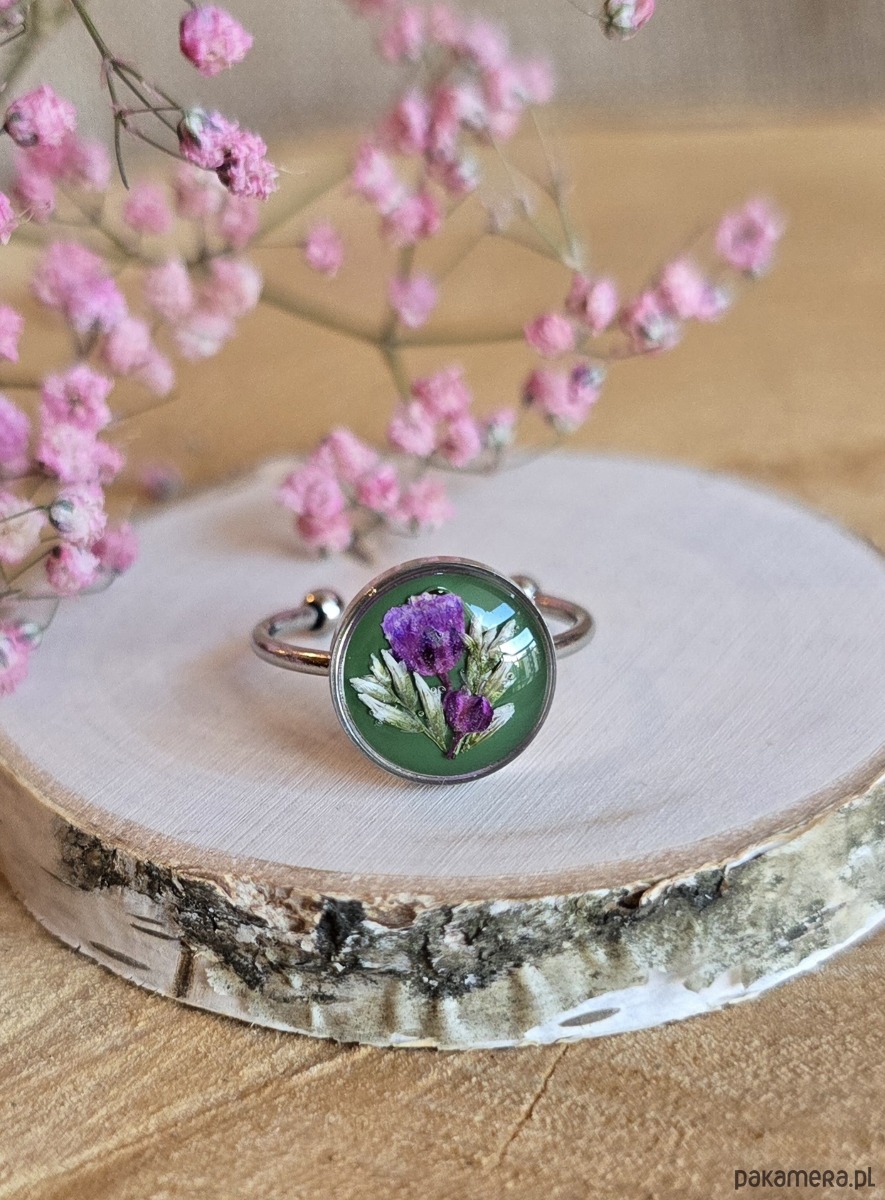 Oferuję Państwu unikalną biżuterię. Pierścionek jest wykonany z suszonych kwiatów i żywicy epoksydowej. Biżuteria jest wspaniałym i oryginalnym prezentem na lata.