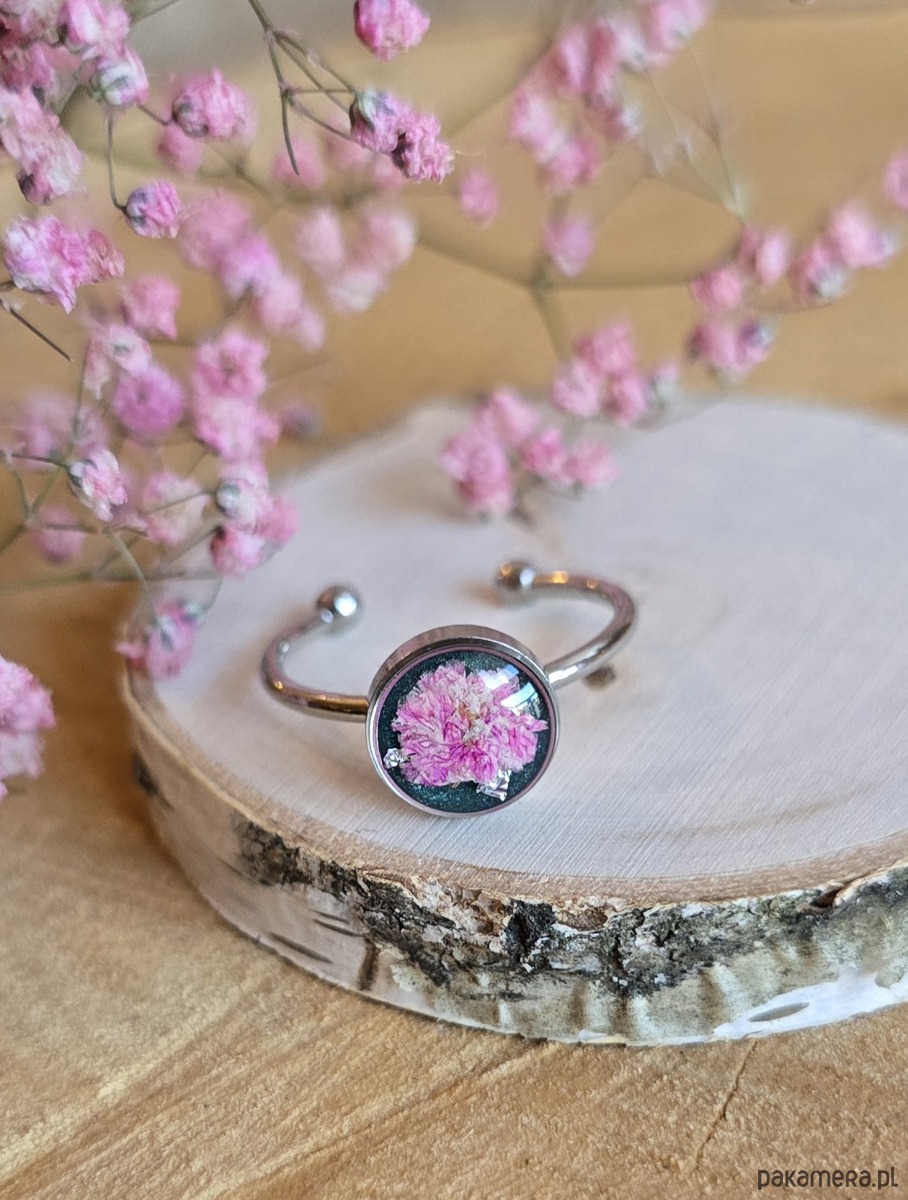 Oferuję Państwu unikalną biżuterię. Pierścionek jest wykonany z suszonych kwiatów i żywicy epoksydowej. Biżuteria jest wspaniałym i oryginalnym prezentem na lata.