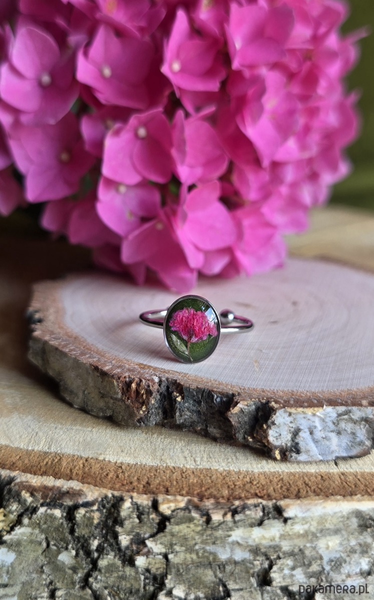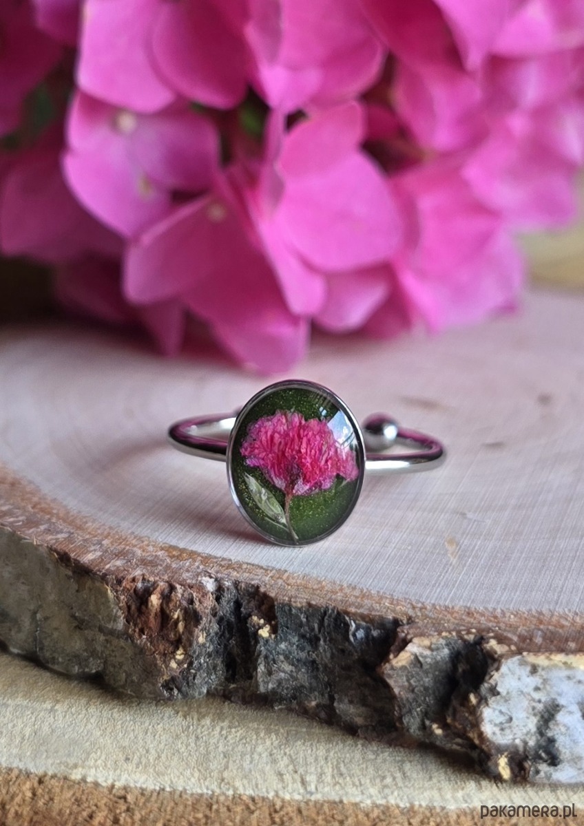 Oferuję Państwu unikalną biżuterię. Pierścionek jest wykonany z suszonych kwiatów i żywicy epoksydowej. Biżuteria jest wspaniałym i oryginalnym prezentem na lata.