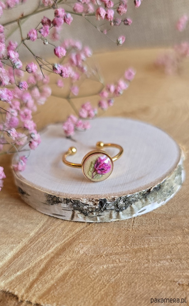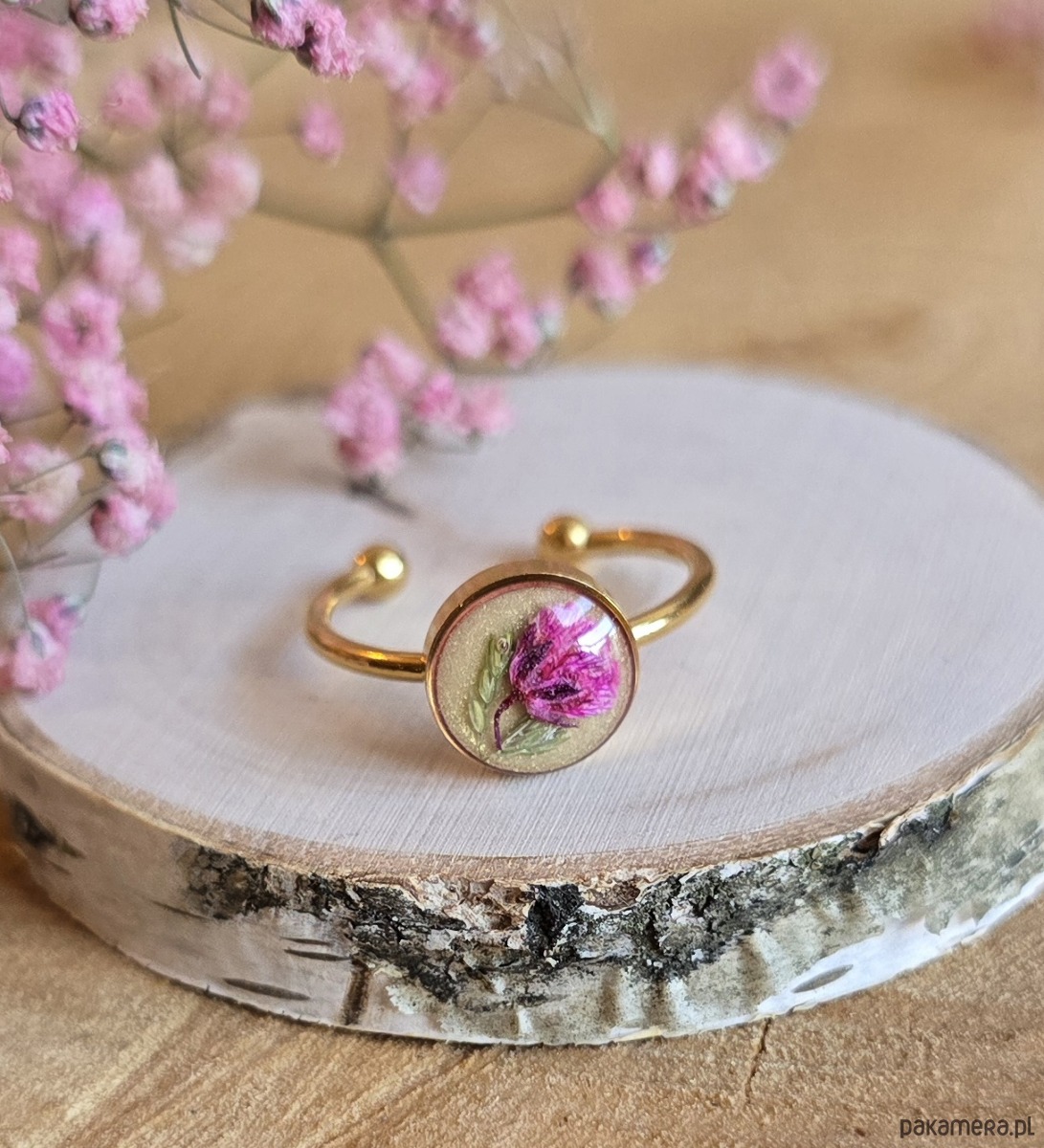 Oferuję Państwu unikalną biżuterię. Pierścionek jest wykonany z suszonych kwiatów i żywicy epoksydowej. Biżuteria jest wspaniałym i oryginalnym prezentem na lata.