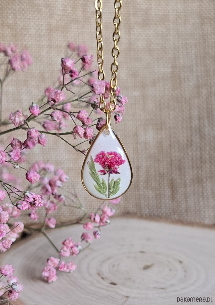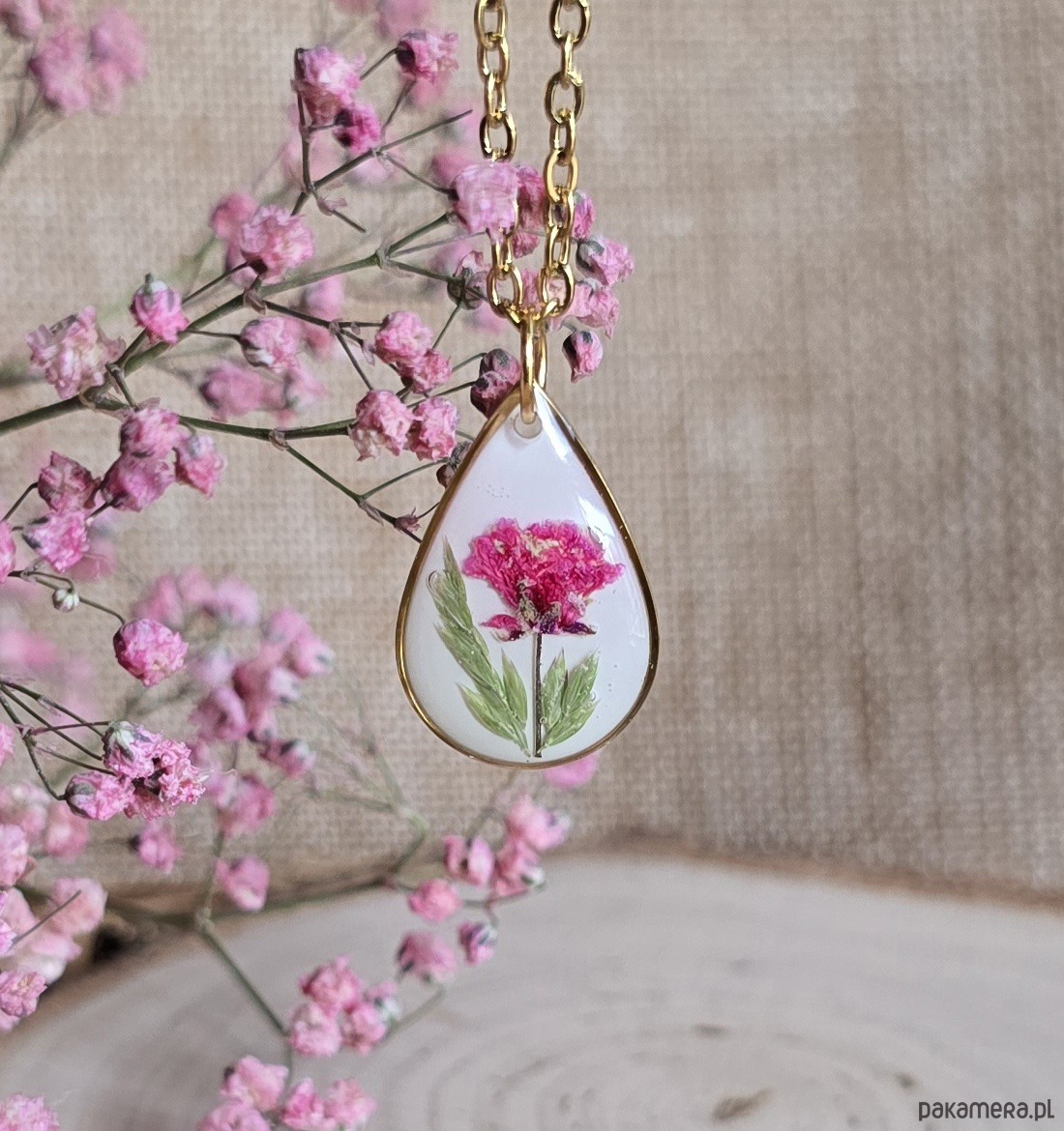 Oferuję Państwu unikalną biżuterię. Zawieszka jest wykonana z suszonych kwiatów i żywicy epoksydowej. Biżuteria jest wspaniałym i oryginalnym prezentem na lata.