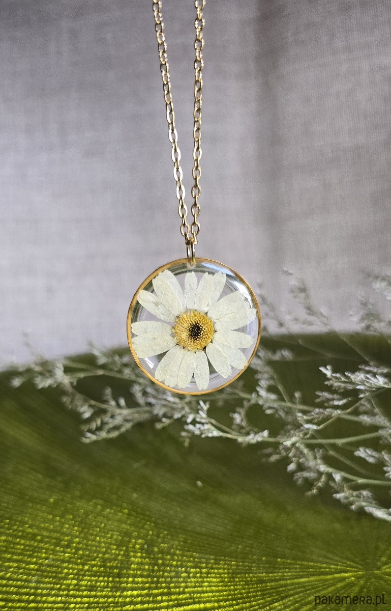 Oferuję Państwu unikalną biżuterię. Zawieszka jest wykonana z suszonych kwiatów i żywicy epoksydowej. Biżuteria jest wspaniałym i oryginalnym prezentem na lata.