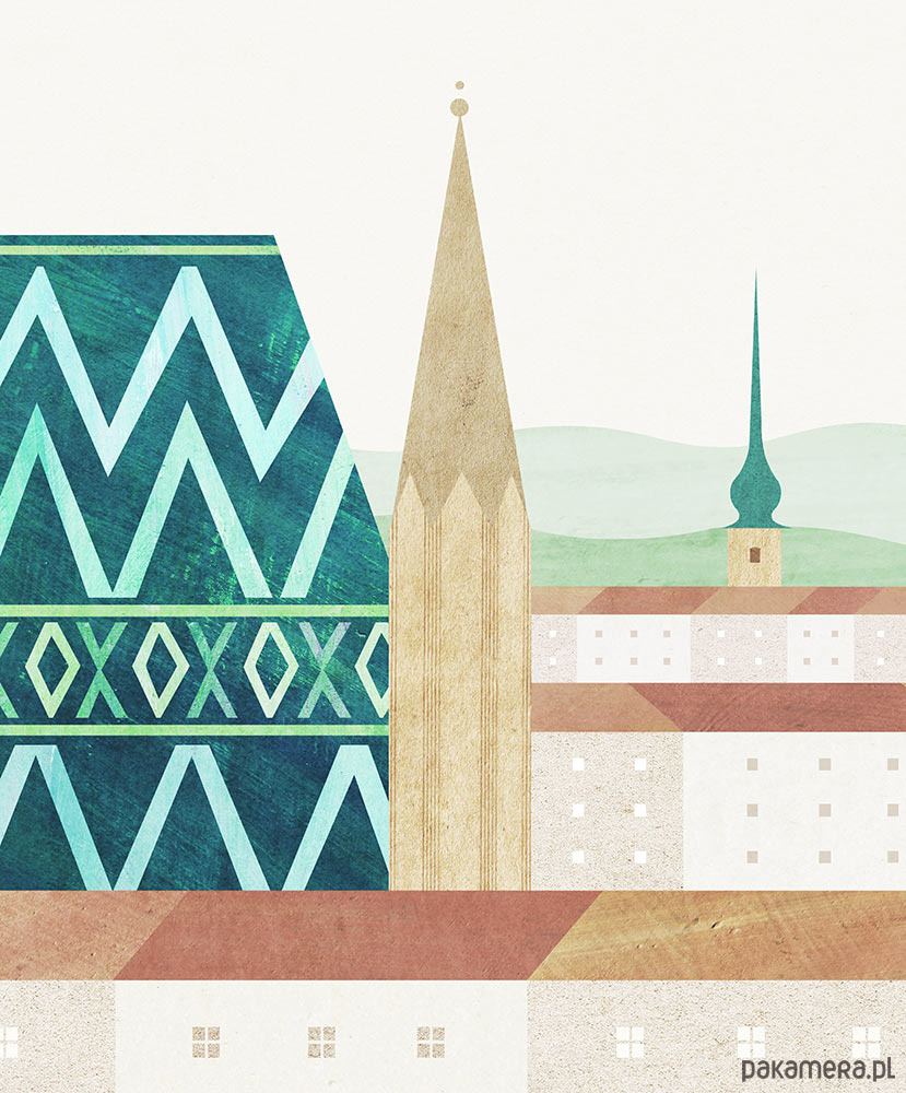 Plakat podróżniczy przedstawiający panoramę malowniczych dachów starego miasta w Wiedniu. Na pierwszym planie widnieje turkusowy wzór dachu Katedry św. Szczepana - symbolu stolicy Austrii. Grafika w stylu vintage, w stonowanych, eleganckich barwach.