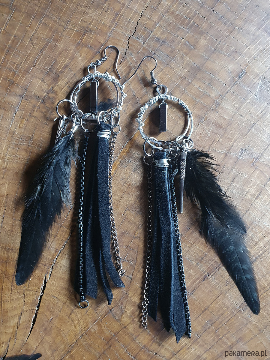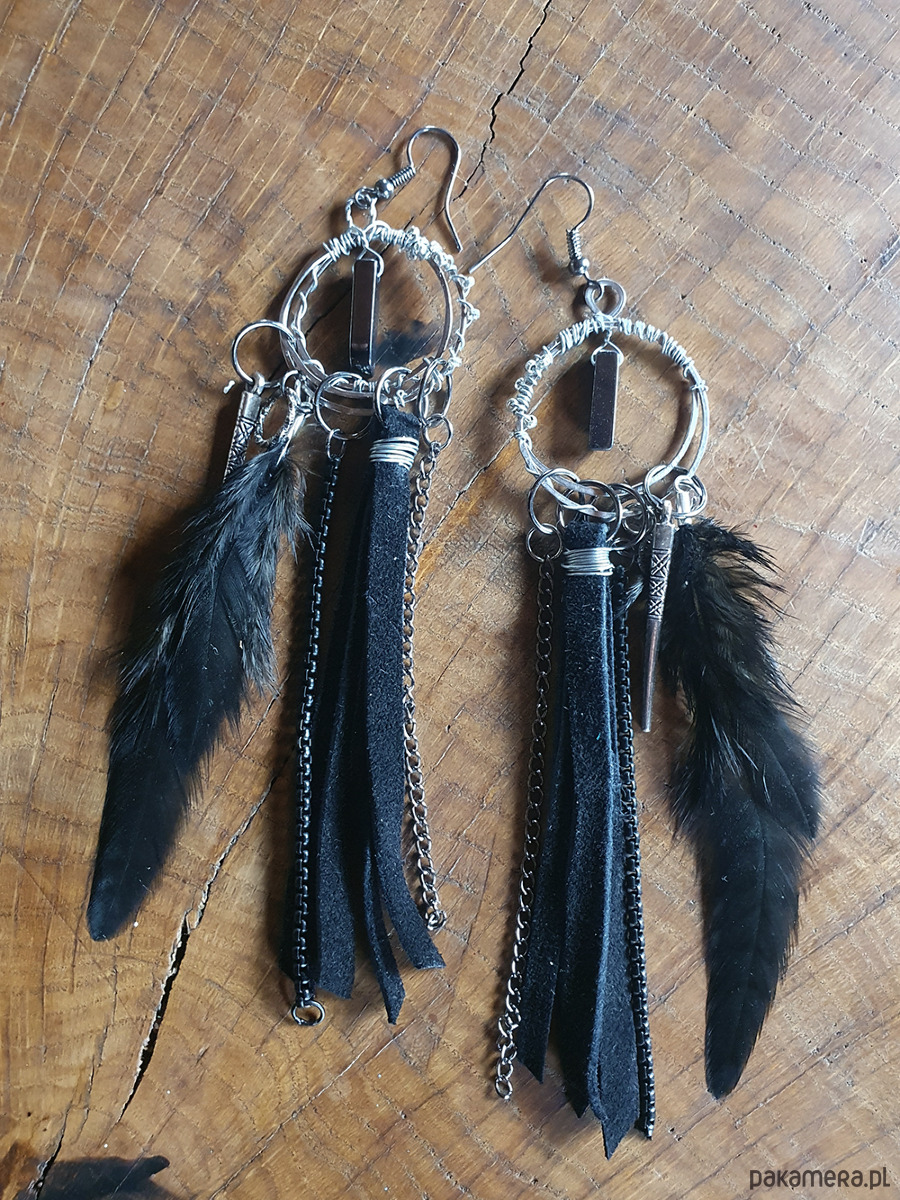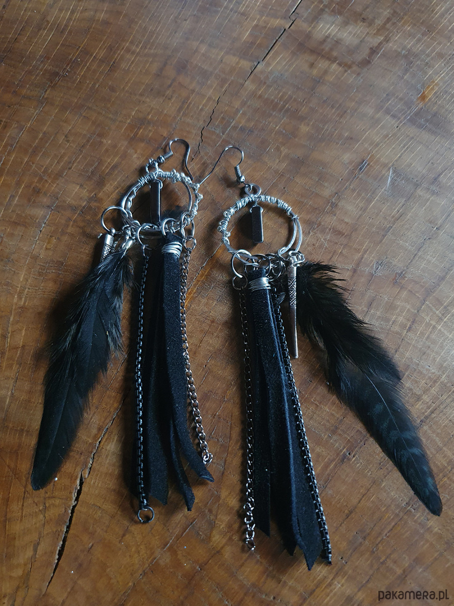 Kolczyki wykonane z metalowego drutu aluminiowego ,rzemienia, piór naturalnych, koralików metalowych i zawieszki z hematytu