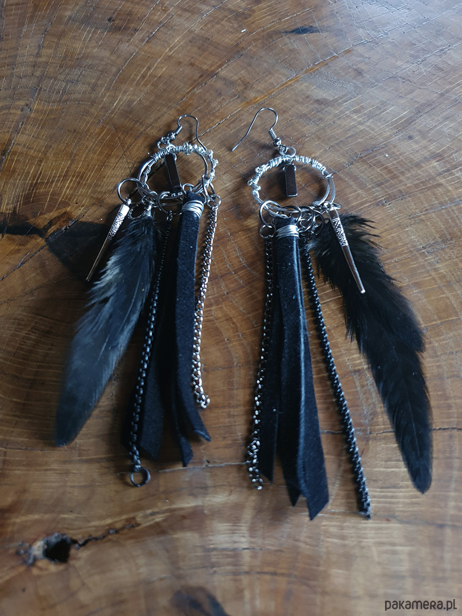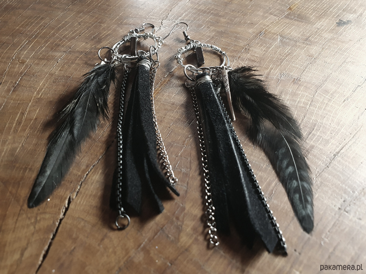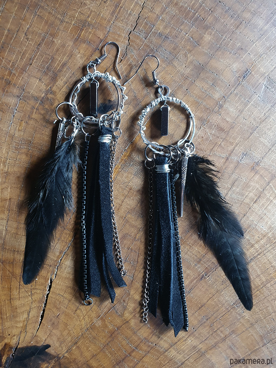 Kolczyki wykonane z metalowego drutu aluminiowego ,rzemienia, piór naturalnych, koralików metalowych i zawieszki z hematytu