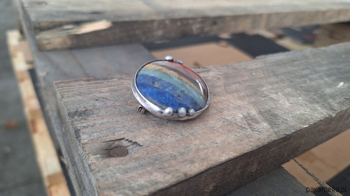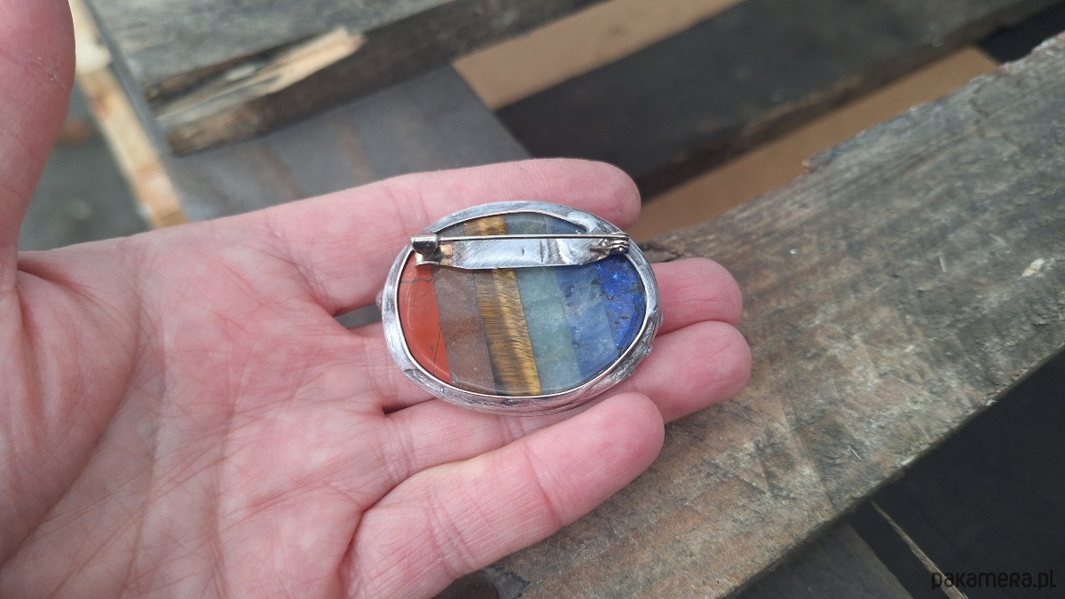 Broszka wykonana z miedzi, cyny i rożnych minerałów, połączonych w jeden. Wymiary ok. 4.5 na 3.5 cm.
