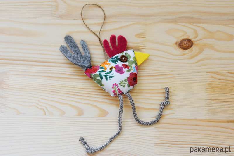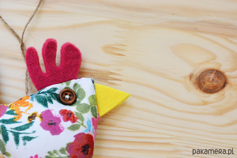 zawieszka wielkanocna wykonana z pięknej, wiosennej tkaniny w kwiaty. dziubek, grzebień i ogon wykonane z filcu. oczko z drewnianego guzika. kurka wypełniona została mięciutkim wkładem poliestrowym a jej długie nóżki zrobione z szarego bawełnianego sznurka. wielkość tułowia to ok. 9cm x7cm. zapraszam :)