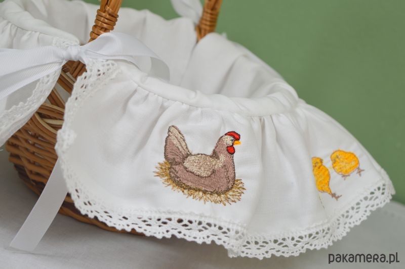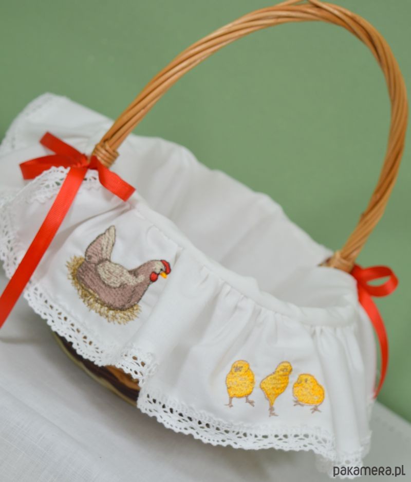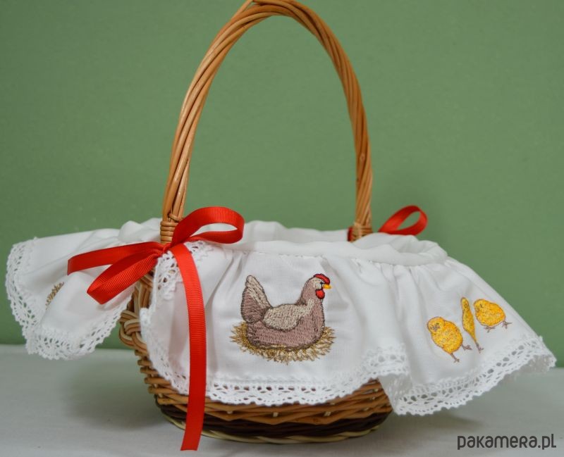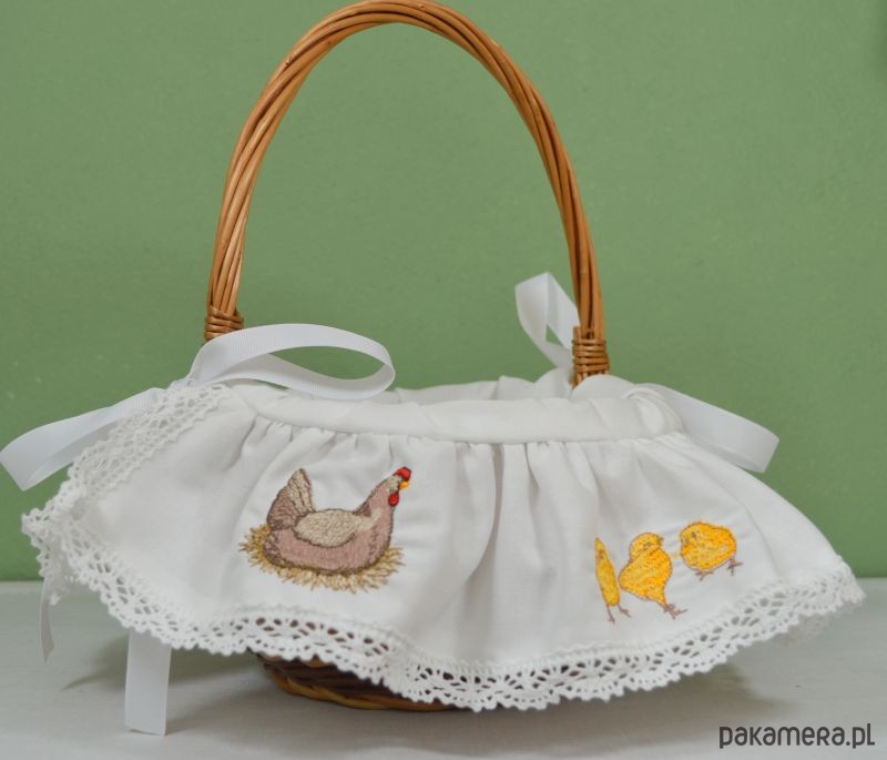 Przedstawiamy koszyczek z bawełnianym obszyciem zdobiony misternie wykonanymi haftami, wykonany w naszej pracowni. Urocze hafty w postaci wielkanocnej scenki, dodają koszyczkowi niepowtarzalnego charakteru. Koszyk nawiązuje do naszych rodzimych tradycji, co czyni go wyjątkowym! Oddajemy w Państwa ręce produkt wysokiej jakości, wielokrotnego użytku. Przekonaj się jak piękna może być święconka w naszym koszyku! Wymiary: średnica 20cm wysokość 12/30cm Tkanina: 100% bawełna UWAGA: po dokonaniu zakupu, wybierz kolor wiązania: biały bądź czerwony! W przypadku nie dokonania wyboru, wysyłamy losowo :) Koronka wykorzystana do obszycia koszyczka może się różnić wzorem od tej na zdjęciu, wynika to ze stanów magazynowych, nie ujmuje to jednak uroku koszyczkowi! Kolory zdjęć na monitorze mogą się różnić od kolorów rzeczywistych produktu. Koszyki wyplatane są ręcznie, stąd mogą występować niewielkie różnice. Kupuj Polskie Produkty!