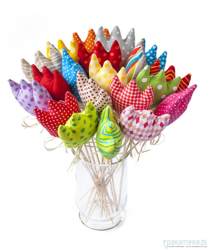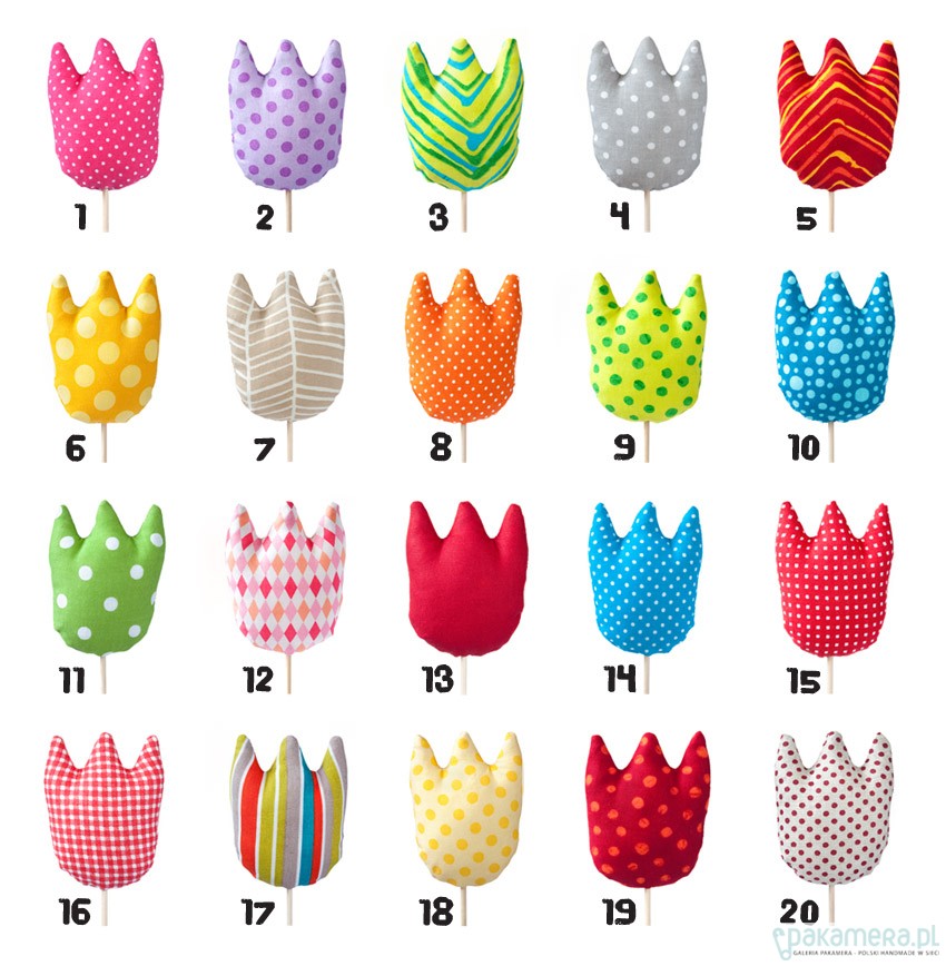 Wybierz swoje ulubione, wiosenne kolory :) Tulipany na patyku wykonane z wysokogatunkowej bawełny z przewiązaną kokardką Zastosowano antyalergiczne wypełnienie. Idealne do wiosennej dekoracji wnętrz, doniczek, wazonów. Całkowita wysokość tulipana na patyku to ok. 30 cm (sam kwiat - 8 x 6,5 cm). Po dokonaniu zakupu proszę o przesłanie wiadomości z numerami wybranych ozdób.