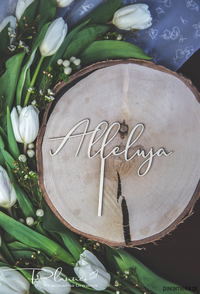 Wyjątkowy topper Alleluja - wykonany z wysokiej jakości sklejki z drzew liściastych o grubości 3,5mm idealnie ozdobi tort lub inne słodkości na Wielkanocnym stole!