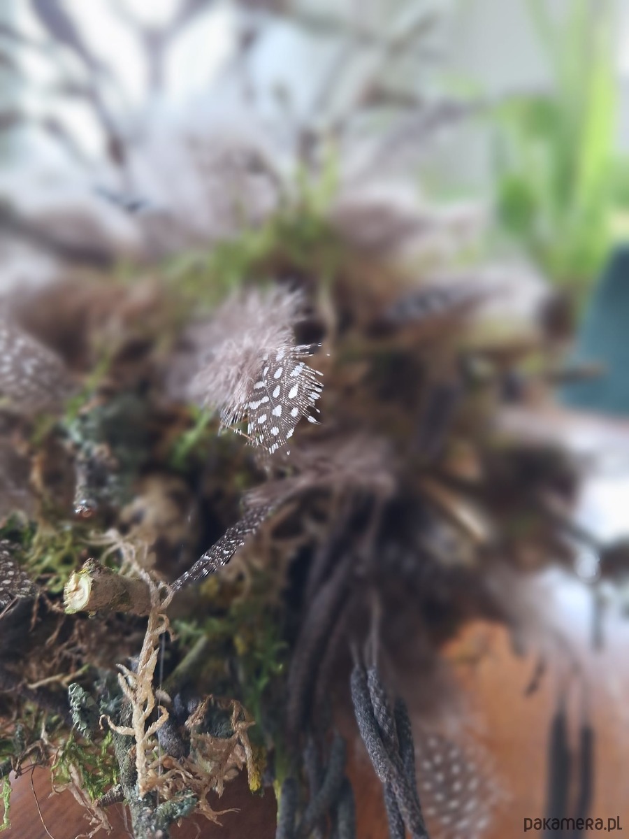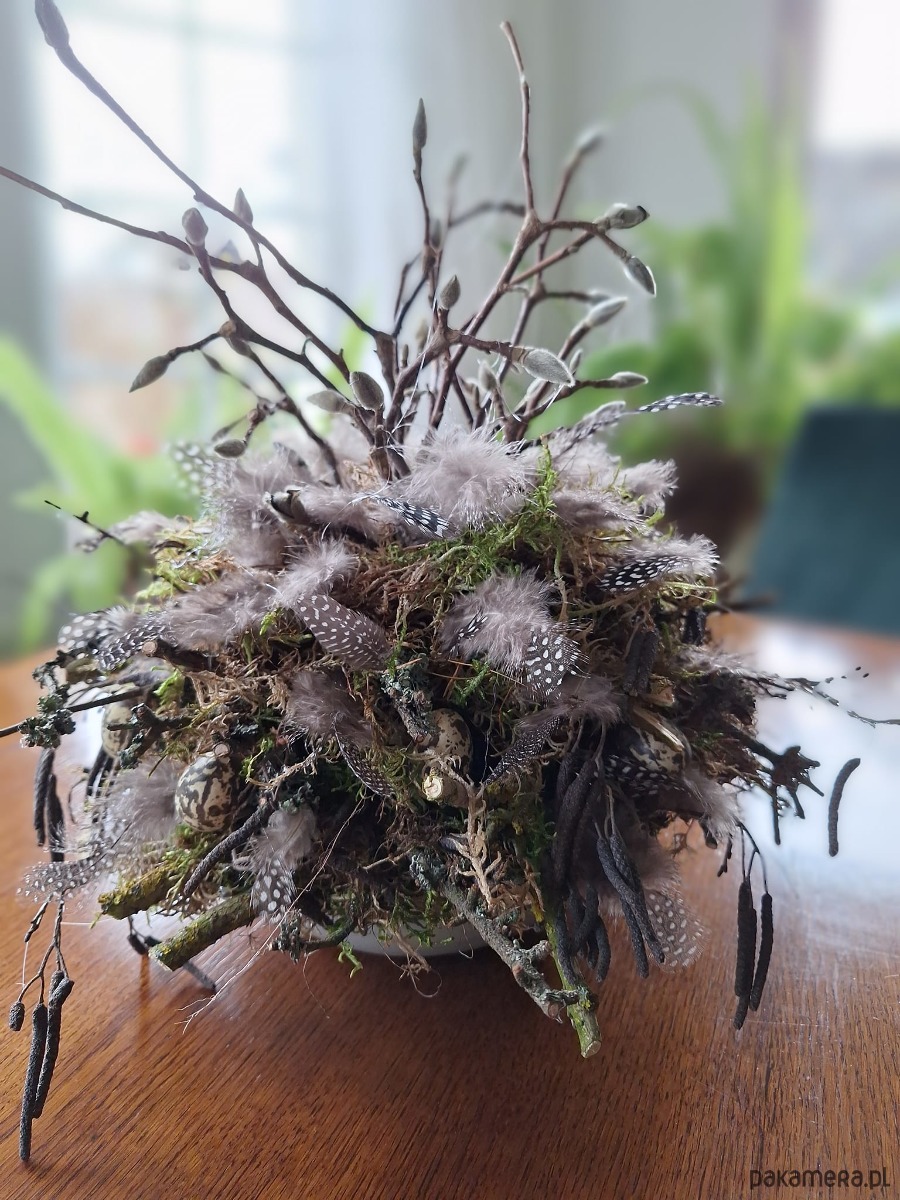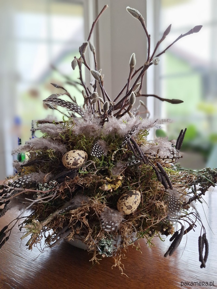 Dekoracja wielkanocna w używanej misce .Mech ,pióra przepiórki i jajka